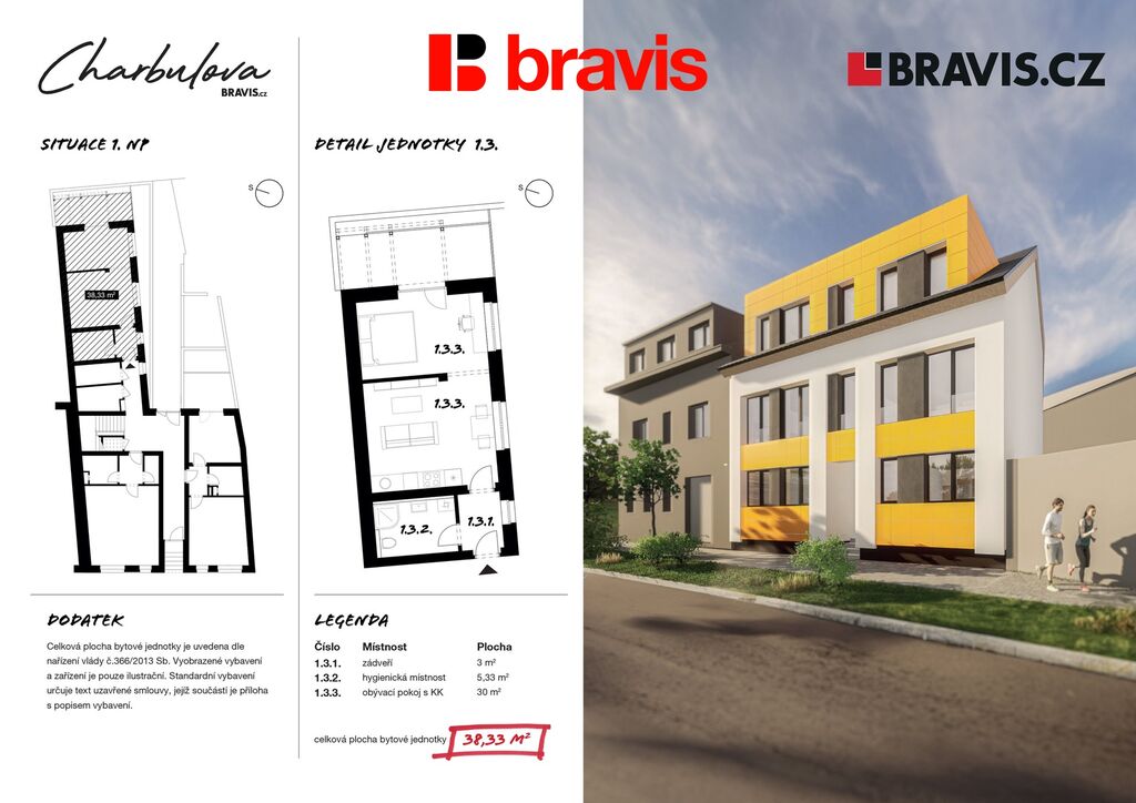 Ve výhradním zastoupení developera Vám představujeme nabídku novostavby bytového domu v Černovicích, na ulici Charbulova. Tento nový bytový dům nabízí komfortní bydlení ve dvou nadzemních podlažích s obytným podkrovím, s celkem 7mi samostatnými bytovými jednotkami o dispozici 1+kk až 2+kk.