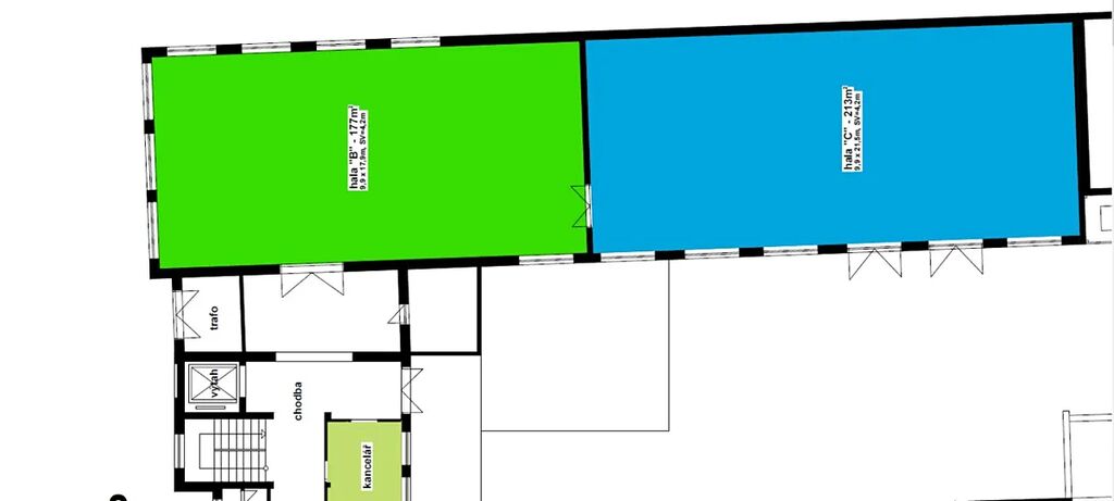 Hala v přízemí, přístupná přes chodbu a rampu, v dobrém a udržovaném technickém stavu.