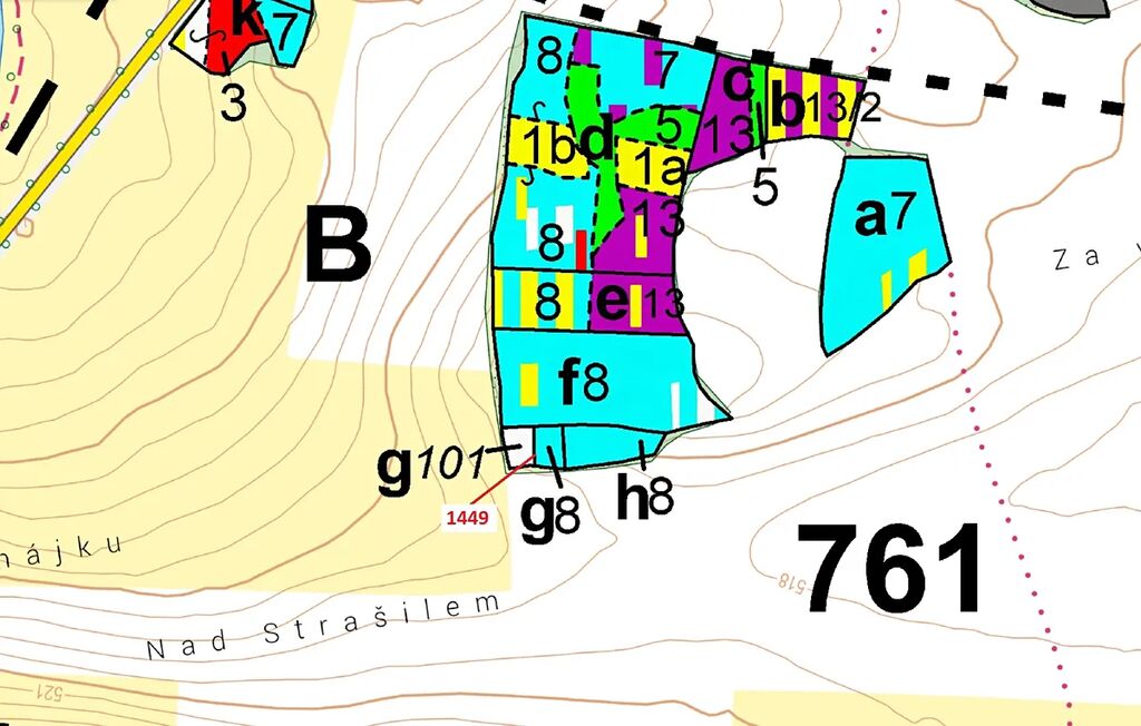 Lesní pozemek o výměře 638 m2, parcelní číslo 1449, podíl 1/1, katastrální území Bezděkov u Kasejovic, obec Hradiště, obec s rozšířenou působností Nepomuk, okres Plzeň-jih, Plzeňský kraj. Po těžbě.