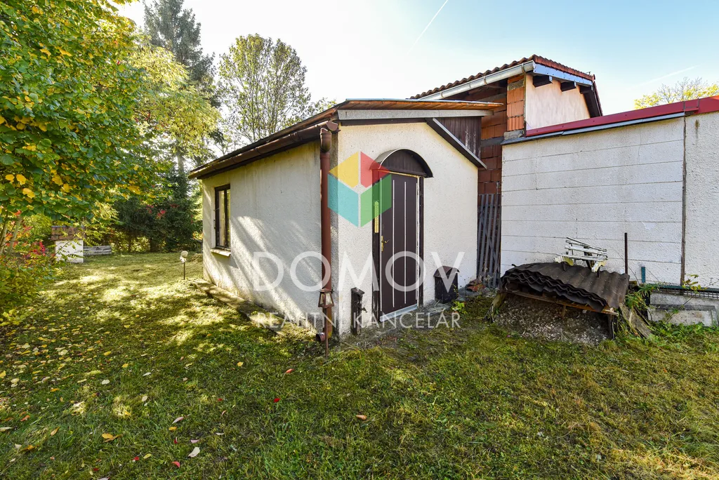 Na zahradě se nachází menší domek s přívodem elektřiny a vody, který může sloužit jako vejminek, letní byt nebo útulné zázemí pro hosty.