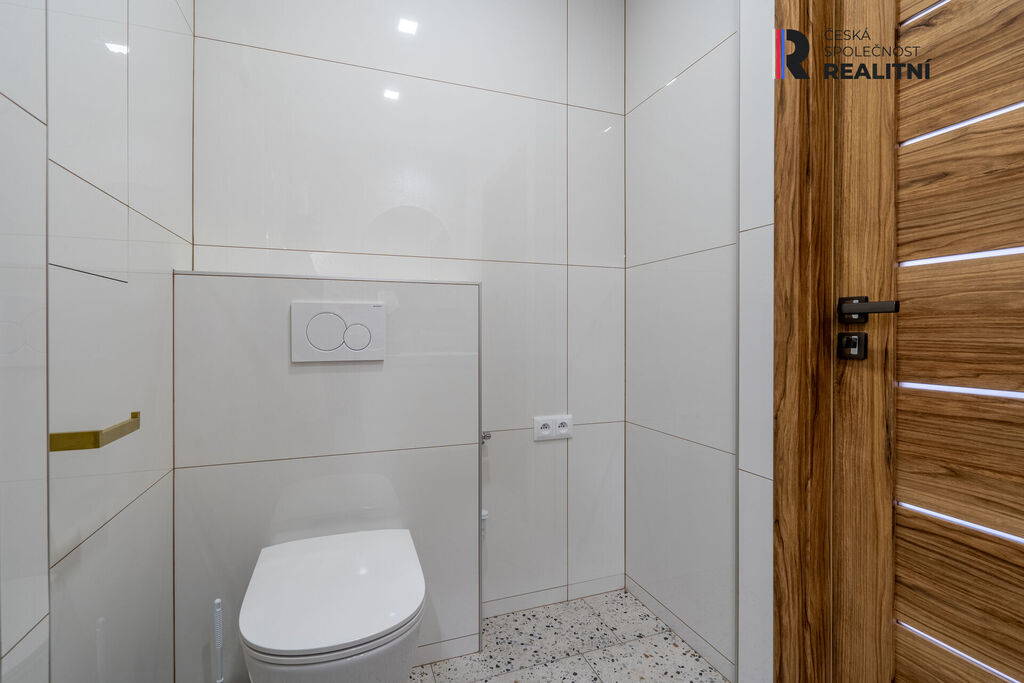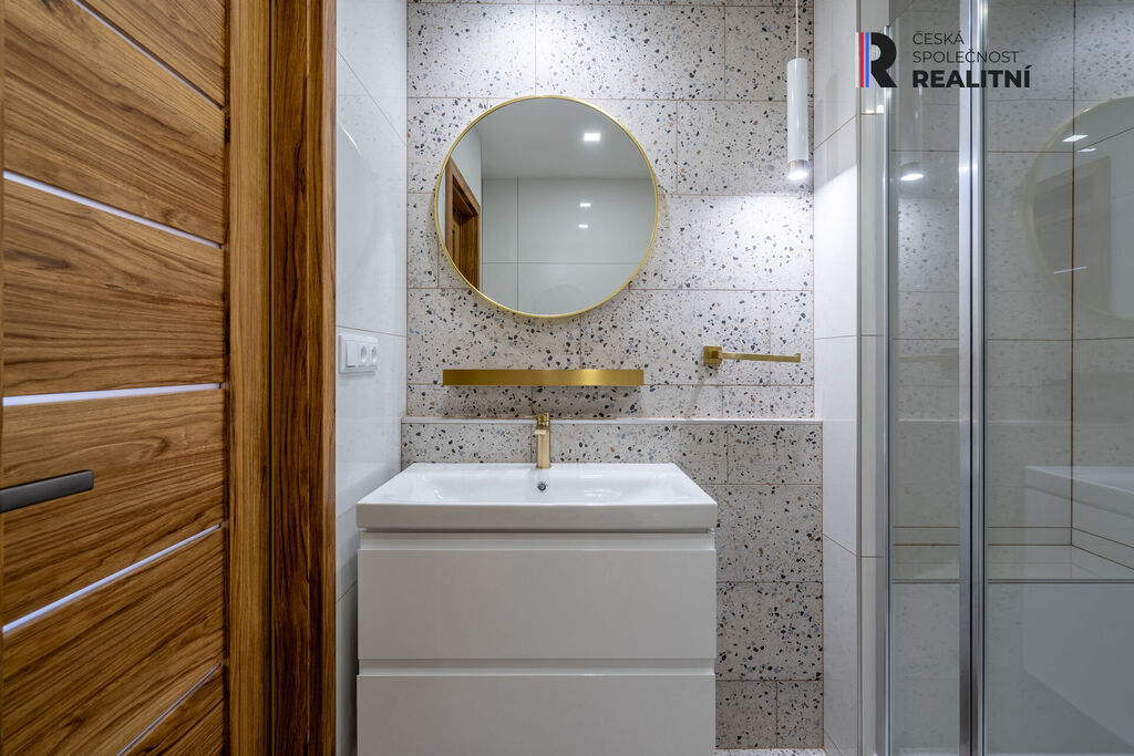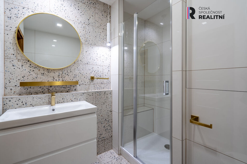 Koupelna - široký sprchový kout, umyvadlo s úložnou skříňkou, zrcadlo, moderní osvětlení a příprava pro pračku i sušičku.