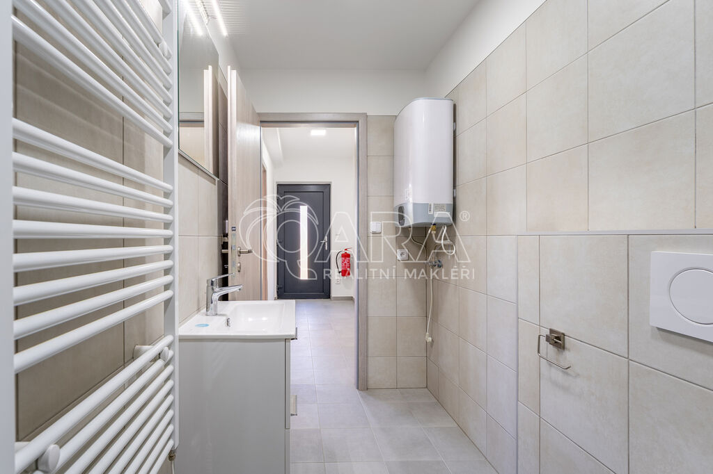 Ateliér o podlahové ploše 33,35 m² se nachází v 1. nadzemním podlaží (přízemí, nejedná se však o bezbariérový přístup) cihlového domu. Ateliér se skládá ze zádveří o výměře 4,7 m², ze kterého vstoupíte do hlavní místnosti o výměře 24,1 m². Součástí je nová kuchyňská linka se spotřebiči (elektrickou troubou, varnou deskou, digestoří a lednicí s mrazákem a přípojkou na pračku, pračka nebude součástí nájmu). Koupelna je vybavena prostorným sprchovým koutem, umyvadlem se skříňkou, zrcadlem a WC.