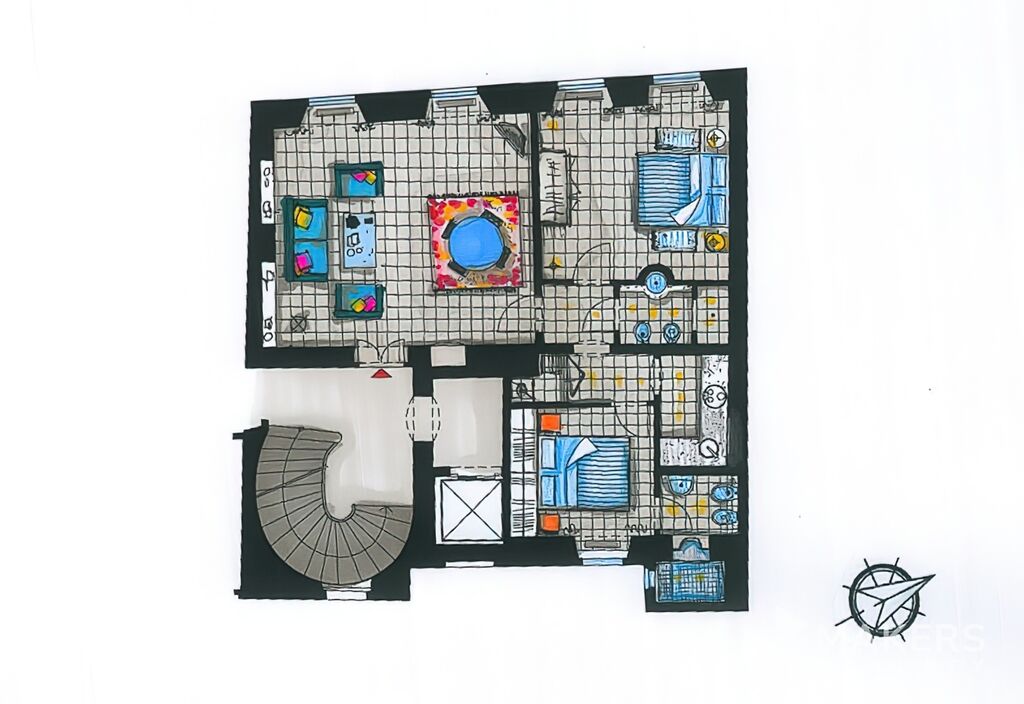 Byt o velikosti 73m2 se nachází ve druhém nadzemním podlaží historického domu, který se nachází v blízkosti Karlova mostu. Dům byl postaven s ohledem na období gotiky, renesance a baroka a současná podoba fasády se nezměnila od 18. století. Interiér tvoří útulný obývací pokoj s jídelním stolem se židlemi, konferenčním stolkem s křesly, stolkem s televizí. Vrcholem místností je původní dřevěný malovaný strop a vlastní krb, který spolu s výhledem na Pražský hrad přímo z pokoje vytváří tu samou jedinečnou atmosféru. Hned vedle je oddělená vybavena kuchyně. K dispozici je technická místnost s pračkou a sušičkou. V bytě jsou 2 ložnice a 2 koupelny, přičemž jedna je se sprchovým koutem, druhá je s romantickou vanou.