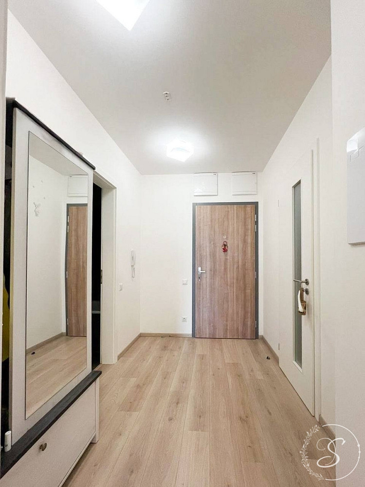 Dispozici tvoří vstupní předsíň s uzavřenou komorou a šatnou, koupelna s vanou opatřenou skleněnou zástěnou, pračkou s integrovanou sušičkou, sanitou a koupelnovým nábytkem s LED osvětlením. Obývací pokoj s kuchyňským koutem je vybaven kvalitní kuchyňskou linkou se zabudovanými spotřebiči (indukční varná deska, myčka nádobí, mikrovlnná a elektrická trouba, digestoř, samostatná kombinovaná lednice). Součástí je také rozkládací sedací souprava, TV stolek s televizí a jídelní stůl se čtyřmi židlemi. Oddělená ložnice nabízí manželskou postel s úložným prostorem a kvalitní matrací, dva noční stolky a velmi prostornou vestavěnou skříň s posuvnými dveřmi.