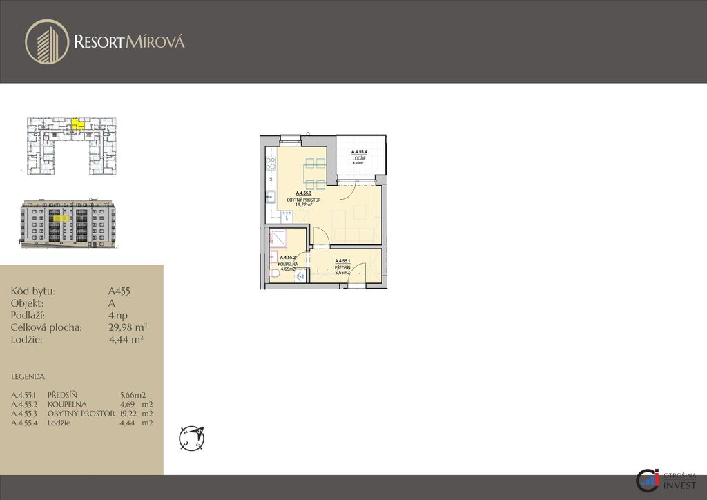Nabízíme vám k prodeji bytovou jednotku o dispozici 1+kk o velikosti 29,98 m² + lodžie o velikosti 4,44 m² v novostavbě projektu Resort Mírová. Byt se nachází ve 4. nadzemním podlaží a je ideální volbou pro jednotlivce, páry nebo jako investiční příležitost.