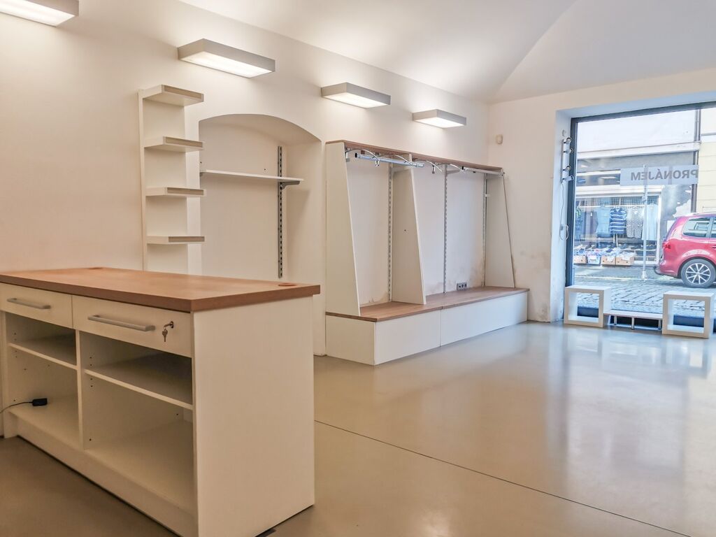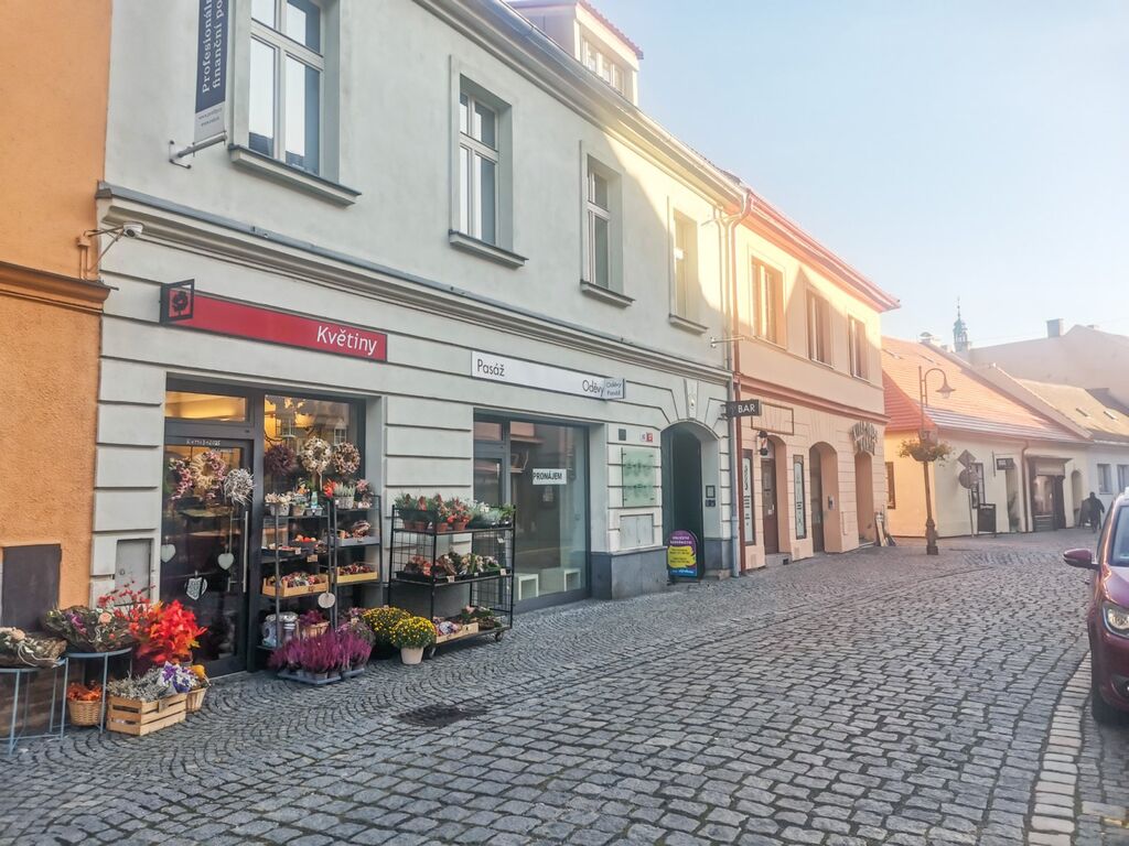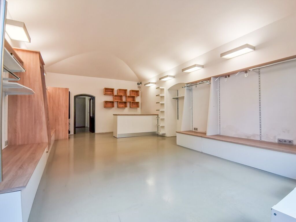 Prostory o celkové výměře 45 m2 jsou zkolaudovány jako prodejna a od předchozího nájemce jsou zařízeny vestavným nábytkem pro prodej oblečení. Skládají se z: prodejní místnosti (33m2) do ulice s velkou výlohou, skladem 10m2 (bez okna), vlastní WC s předsíňkou (2m2) . Prostory disponují druhým vchodem z pasáže domu pro zásobování, jsou vybaveny alarmem, osvětlením. Podlahové krytiny stěrkové s podlahovým topením.