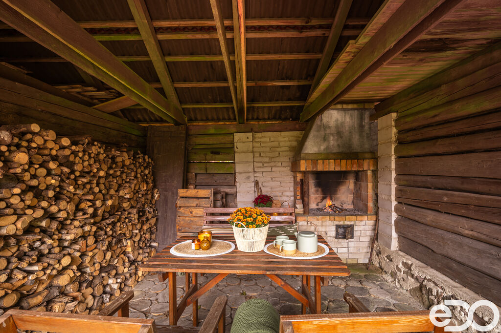 Na rozsáhlém pozemku o rozloze 3 113 m² je k dispozici venkovní posezení s krbem, ideální pro letní grilování a odpočinek s rodinou či přáteli.