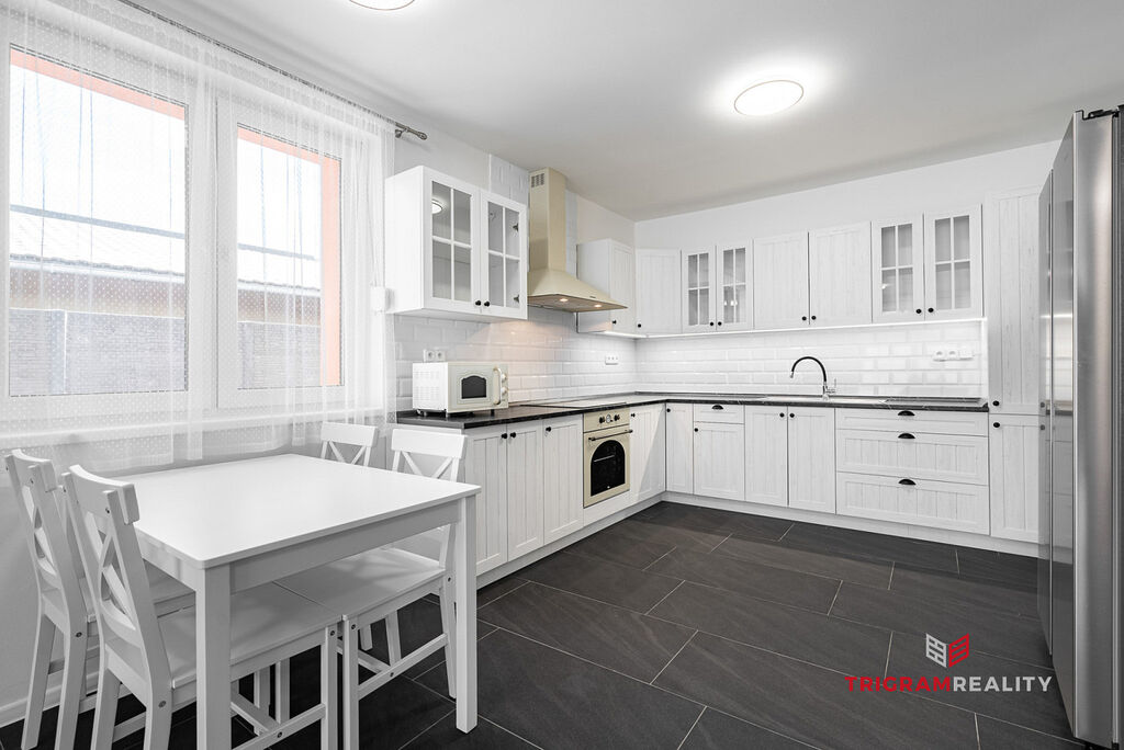 Je zde nová kuchyňská linka s vestavěnými spotřebiči (kromě myčky nádobí), a prostorná americká lednice.