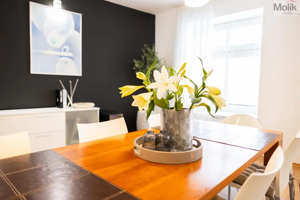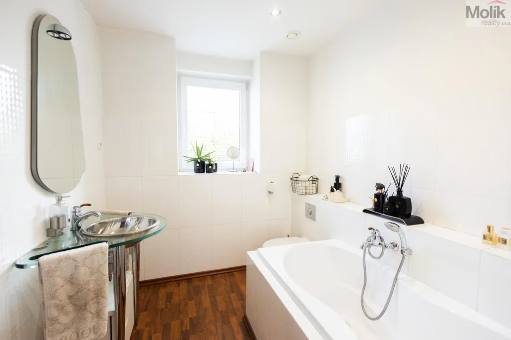 Nabízí tři samostatné pokoje, kuchyň, koupelnu s vanou a vířivkou, saunu a velkou technickou místnost, ve které je pračka, sušička, žehlící prkno i věšák na prádlo. Celý byt působí velmi útulně, je světlý, moderní a prakticky řešený.