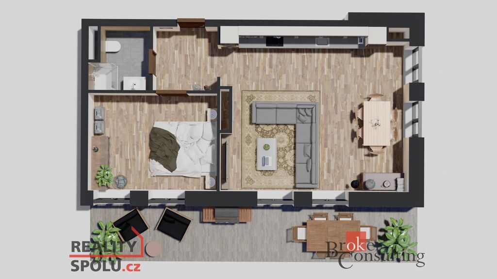 K bytu náleží prostorná terasa o výměře 43,48 m² a přímý vstup na vlastní zahrádku, ideální pro relaxaci nebo rodinné posezení.