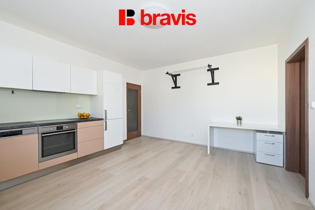 Po vstupu do bytu Vás přivítá chodba s botníkovou a šatní stěnou. Hlavní obytný prostor tvoří světlý obývací pokoj propojený s moderní kuchyňskou linkou, která je plně vybavena myčkou, troubou, lednicí s mrazákem a digestoří. V obývací části se nachází jídelní stůl se 2 židlemi i pracovní stůl.