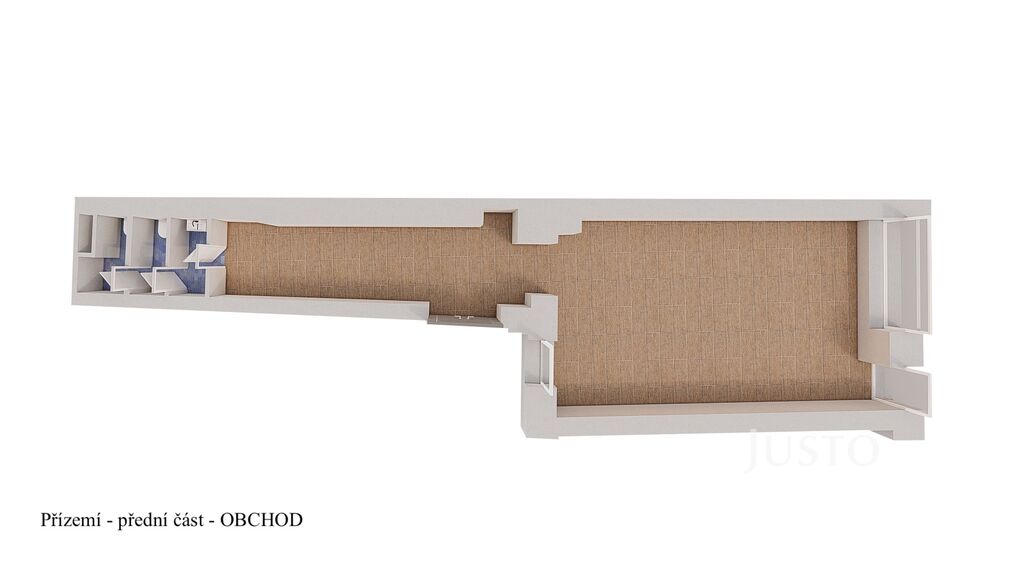 Přízemní prostor (150 m²) s výlohou přímo na náměstí – V přední části se nachází zavedená prodejna s nájemní smlouvou do roku 2027, v zadní části pak kanceláře s vlastním zázemím. Díky samostatným měřičům elektřiny, vody i topení mohou být obě části využívány odděleně.