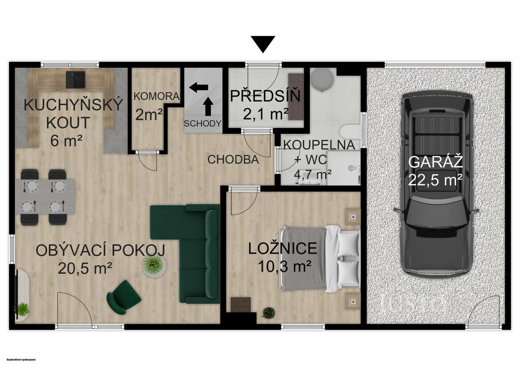 Dům je dispozičně řešen jako 5+kk se dvěma koupelnami, šatnou, garáží a terasou.