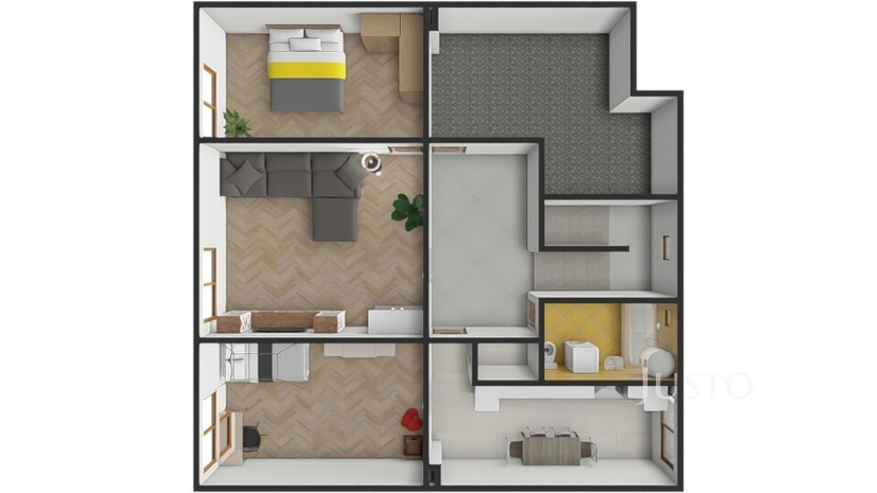 Přízemní byt nabízí kuchyň s praktickou spíží, obývací pokoj, ložnici, koupelnu s vanou a samostatnou toaletu. V patře se nachází kuchyně rovněž se spíží, obývací pokoj, dvě ložnice a koupelna s toaletou. Z patra je dále přístup do podkroví, které skýtá možnost dalšího rozšíření obytné plochy.