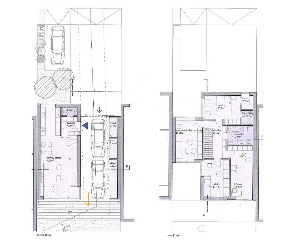 Dispozice domu 5+kk + zahrada + dvougaráž + dvě parkovací stání:
