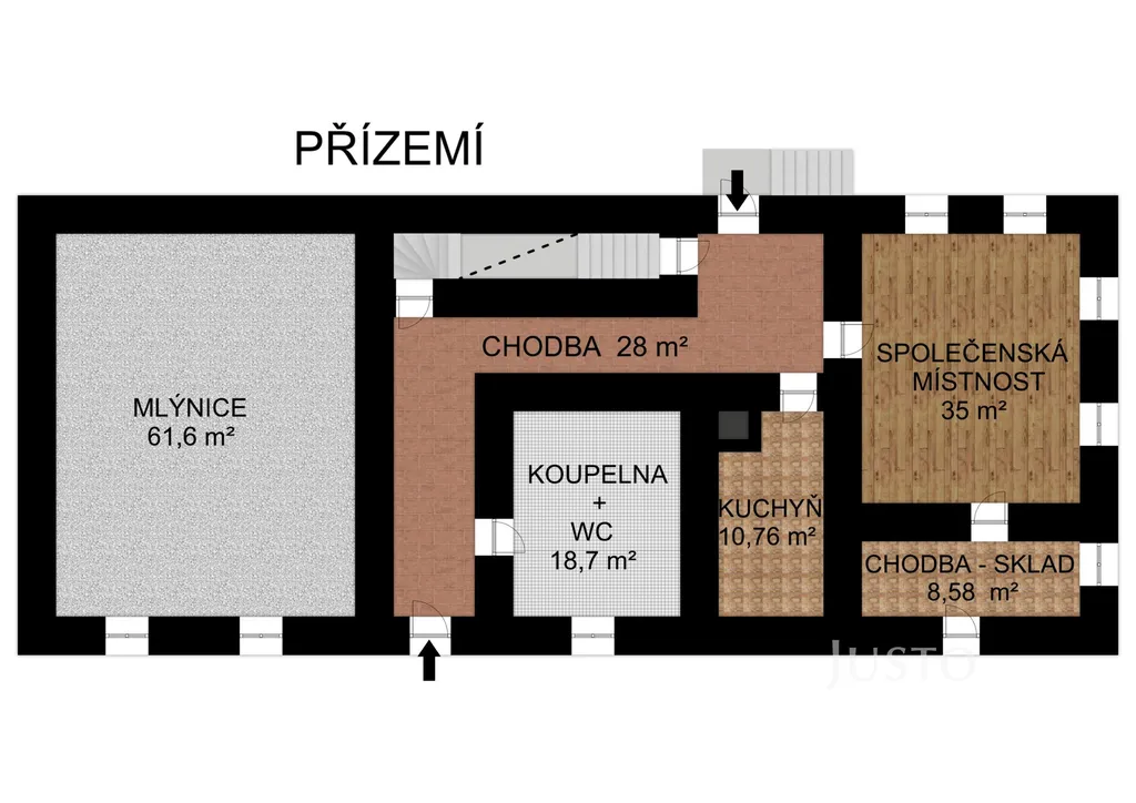 V přízemí domu se nachází hlavní společenská místnost, kde se odehrávaly nejen rodinné oslavy. Dále zde najdete velkou koupelnu (pozn.: historická vlajka zachycená na fotografii je recesí, nikoliv odkazem na minulý režim), skladové prostory a původní kuchyň s unikátním kamenným klenutým stropem – to je prostor, který přímo vybízí k citlivé modernizaci. Ve stodole najdete velké úložné prostory a truhlářskou dílnu.
