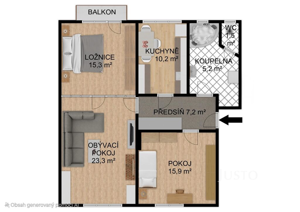 Byt disponuje užitnou plochou 80,1 m², dále k bytu náleží balkon o výměře 4,9 m², prostorný sklep 6,2 m² a společné prostory bytového domu.