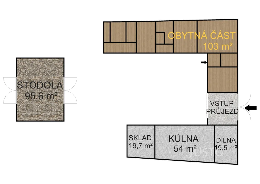 kamenná stodola: 122 m² – vhodná na skladování, nebo s velkým potenciálem pro přebudování na bydlení či jiné využití