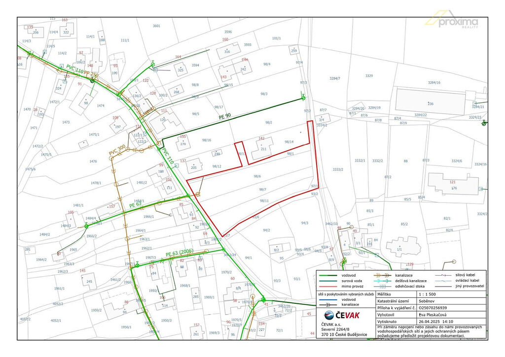 - Elektřina: Podzemní vedení NN je umístěno na okraji pozemku (kaplička). Přes pozemek také vede nadzemní vedení VN a je nutné zachovat ochranná pásma.