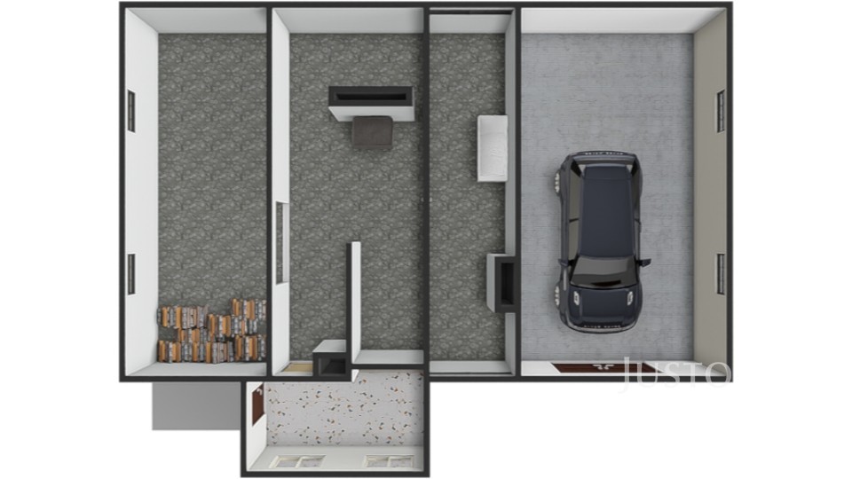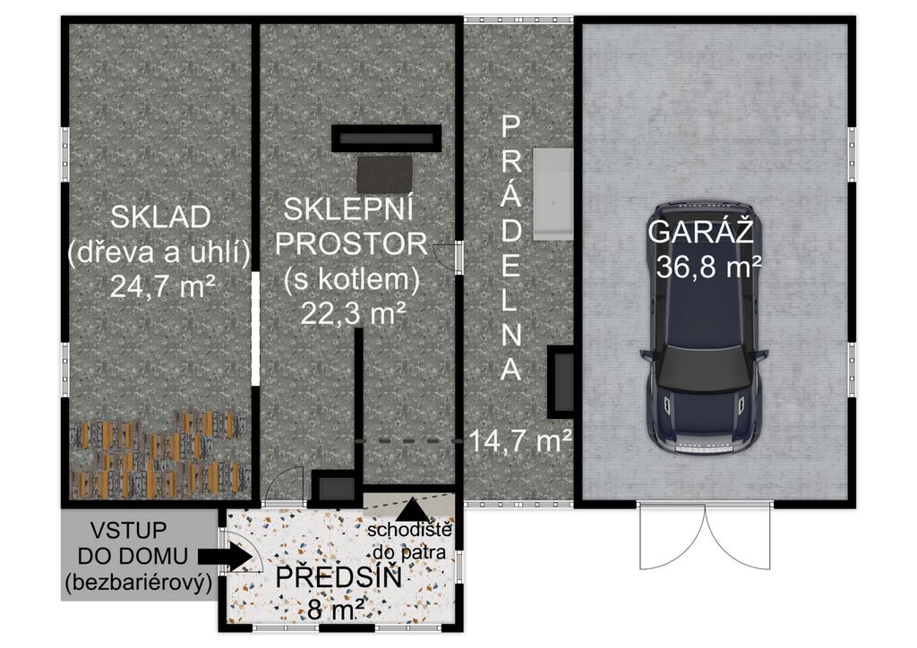 Přízemí: garáž, kotelna s kotlem na tuhá paliva, prádelna a praktické skladovací prostory