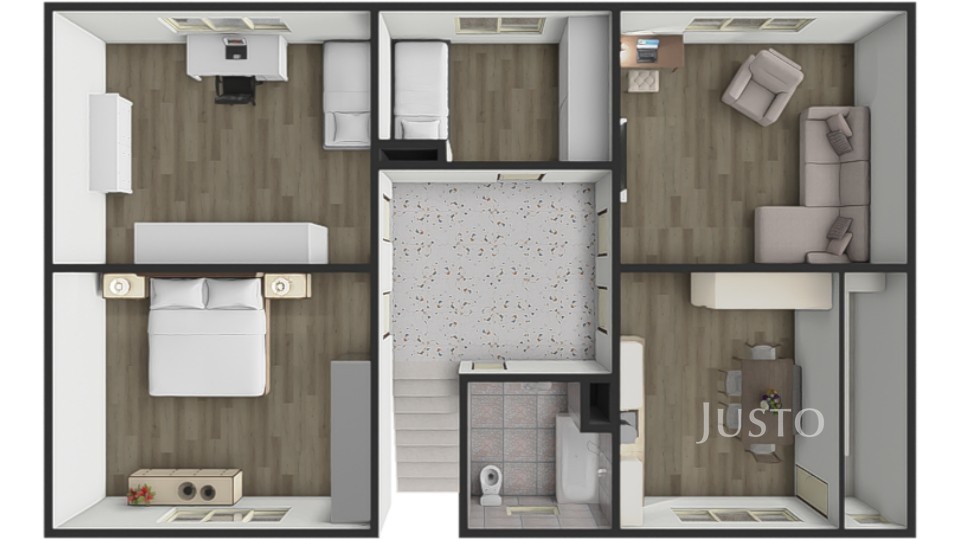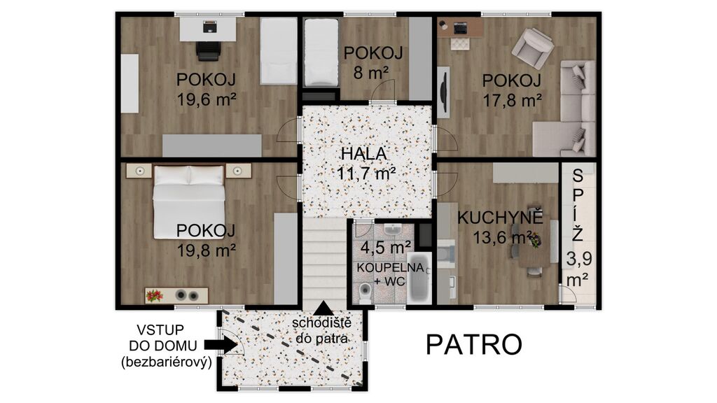 Patro: bytová jednotka 4+1 se spíží, přístupná po vnitřním schodišti vybaveném plošinou pro osoby se sníženou pohyblivostí