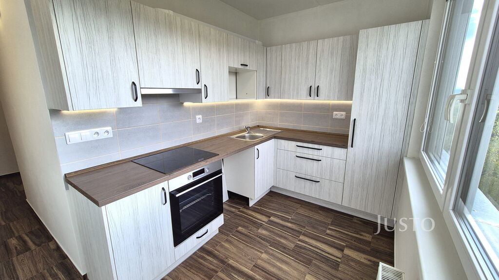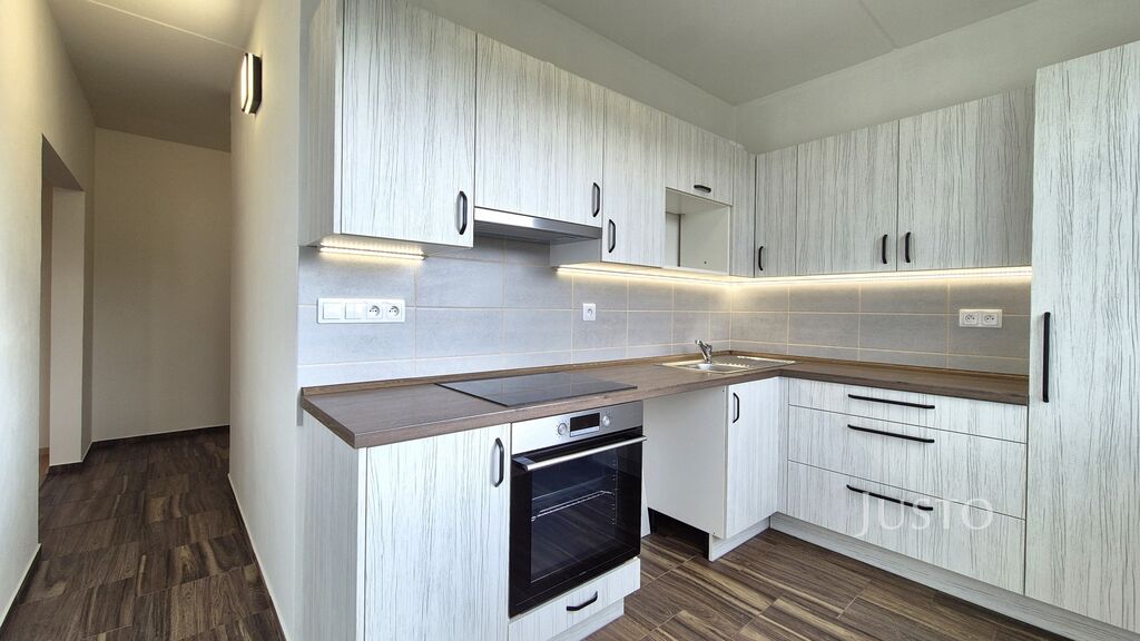 Součástí vybavení je nová kuchyňská linka s vestavnými spotřebiči (mimo myčky nádobí – pro tu jsou připravené přípojky i místo).