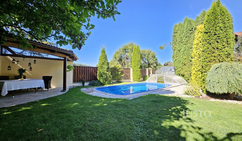 Výměra pozemku činí 777 m². Zahrada nabízí soukromí a díky vzrostlé vegetaci je zde i v letních měsících i potřebný stín. Bazén a pergola dotváří příjemný letní kolorit. Podél domu se nachází zděný dřevník s palivem na několik topných sezón.