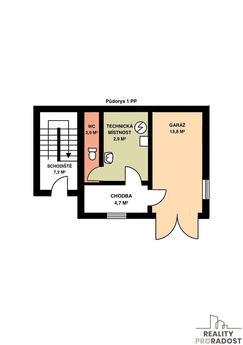 PP (suterén): garáž, technická místnost, toaleta, prostory pro uskladnění sezónních věcí.
