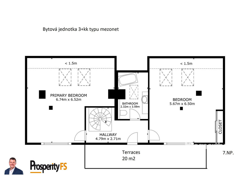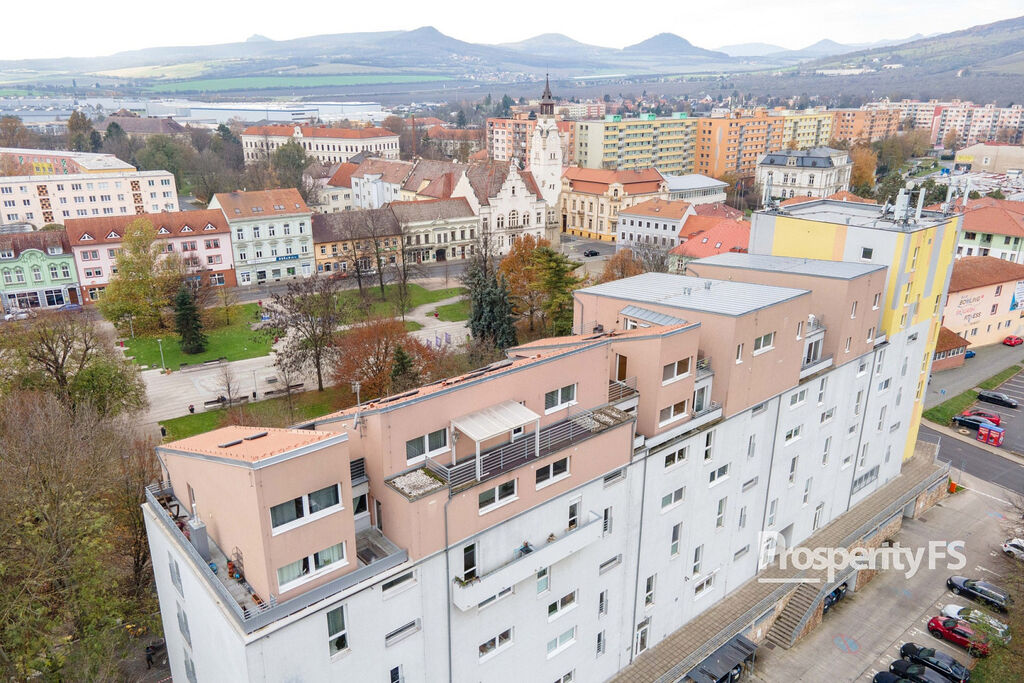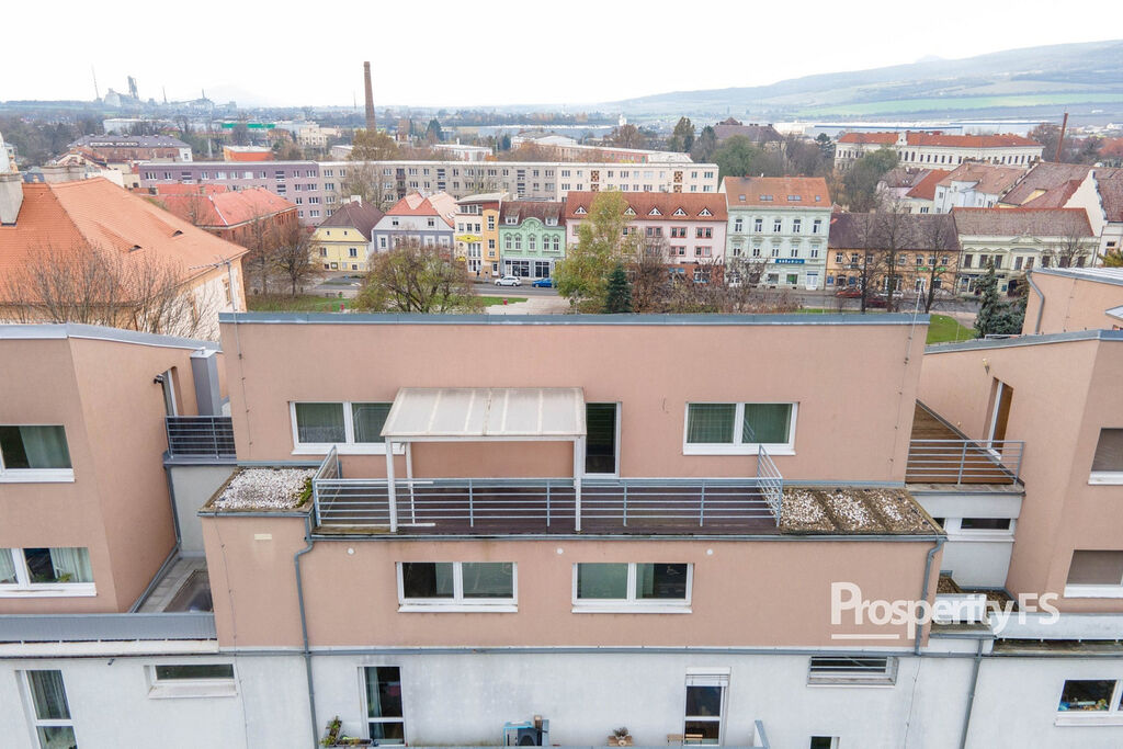 Tento byt se má celkovou plochu 142 m², která se skládá z obytné části o výměře 120 m² a terase o výměře 22 m². Plocha celého bytu se rozkládá v 6 a 7 np. z celkových 7 np. bytového domu v centru Lovosic. Z chodby u bytu je výtah s přímým přístupem do garáží, kde máte k dispozici jedno parkovací místo, a další parkovací stání na soukromém parkovišti přímo před domem.