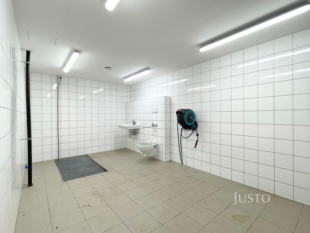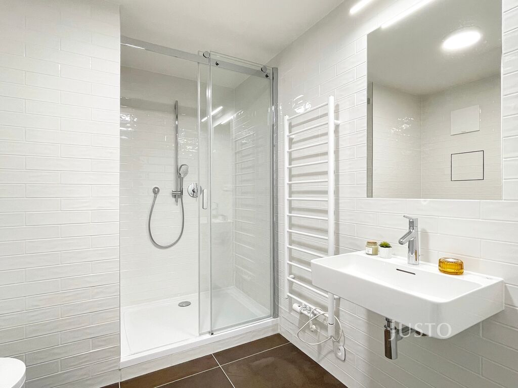 Koupelna se sprchovým koutem, toaletou a umyvadlem disponuje i dostatečným místem pro pračku a sušičku. Samostatná komora v bytě poskytuje další úložný prostor. Vstup do bytu od obývací a spací části oddělují posuvné prosklené dveře.