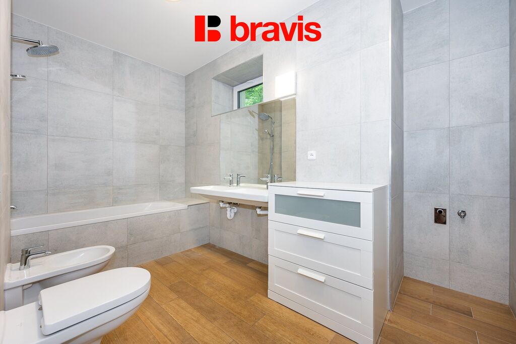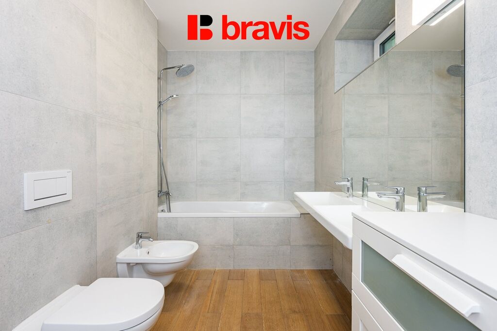 V koupelně je vana, dvě umyvadla, toaleta, bidet a otopný žebřík. Je zde také přípojka na pračku.