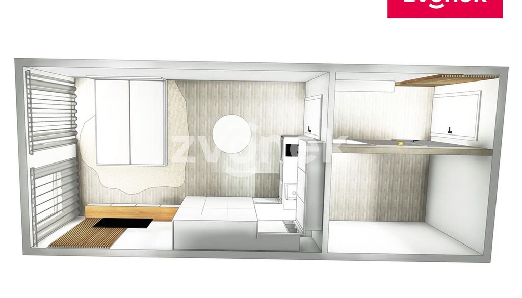 Dispozice je řešena prakticky – hlavní místnost s kuchyňským koutem tvoří velkorysý prostor pro bydlení i práci, samozřejmostí je koupelna se sprchovým koutem, samostatné WC a vstupní chodba. Díky francouzským oknům je interiér krásně prosvětlený a působí velmi vzdušně. Byt je vybaven vestavěnou skříní, kuchyňskou linkou, v koupelně bude pračka se sušičkou. Celý objekt je novostavba ve vysokém standardu. Součástí vybavení je klimatizace, venkovní elektricky ovládané žaluzie, kuchyňská linka se spotřebiči a kvalitní obklady i dlažba v koupelně.