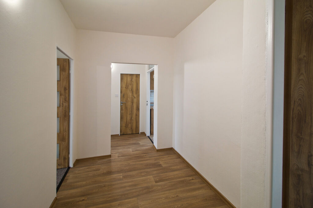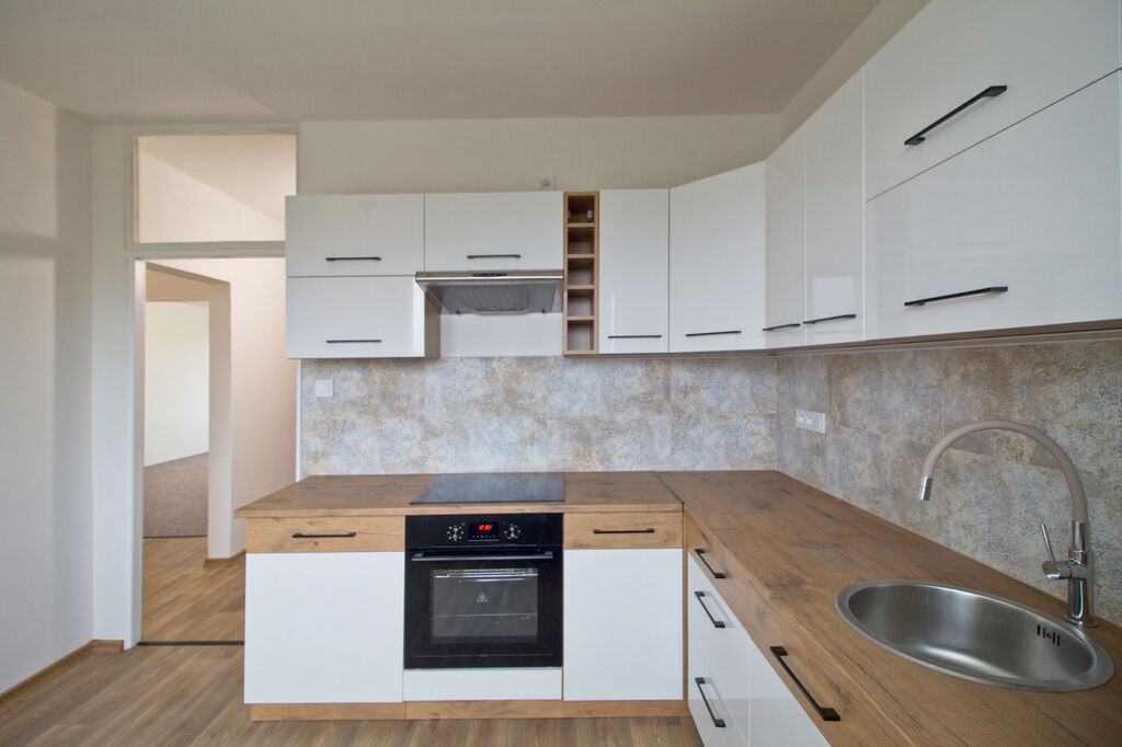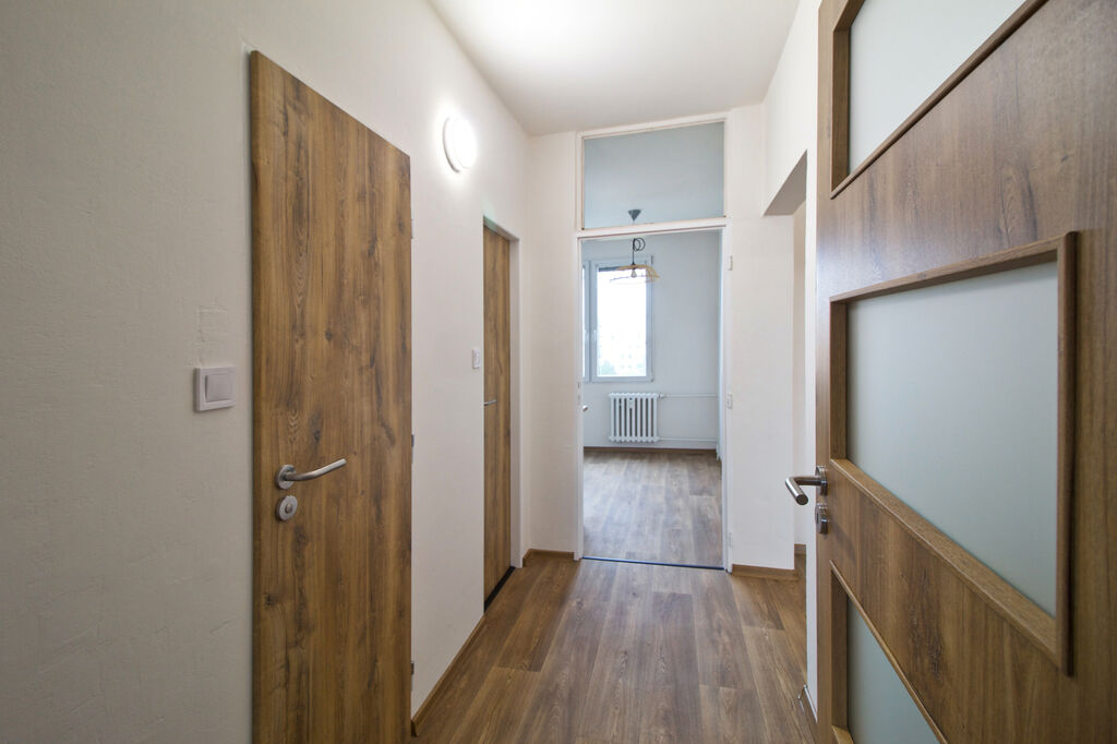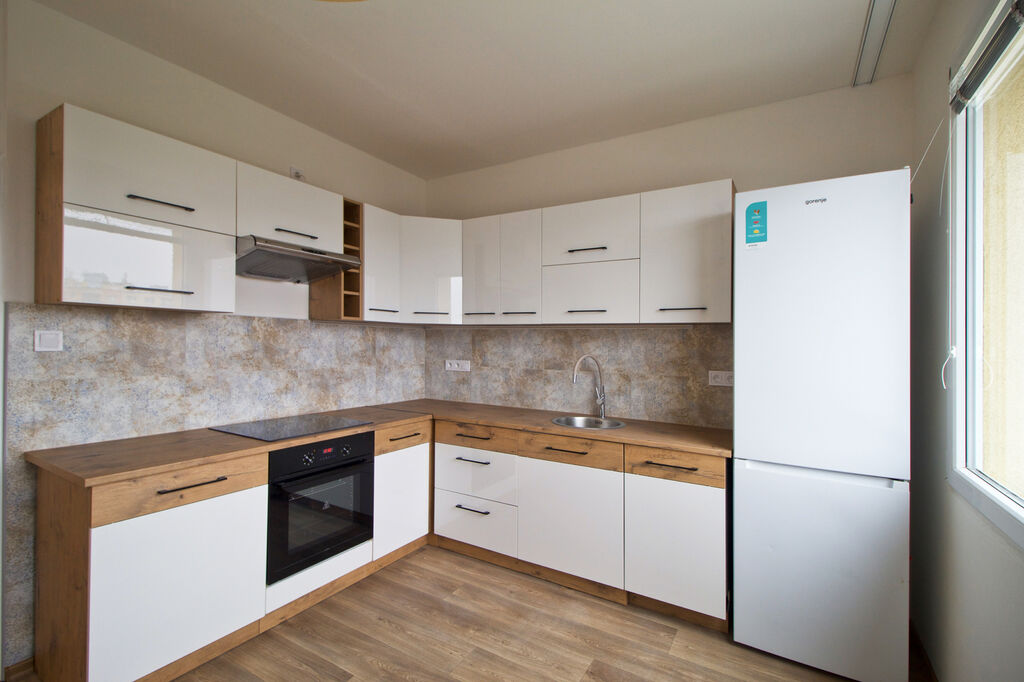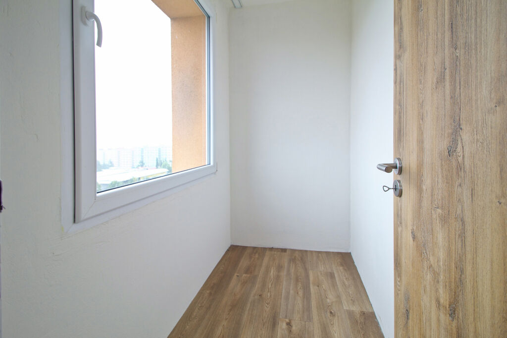 Byt se nachází v 7. podlaží osmipodlažního zatepleného domu. Disponuje třemi samostatnými pokoji, z nichž jeden má přímý vstup na lodžii orientovanou na západ. U ložnice se nachází další menší místnost s oknem, kterou lze využít jako šatnu nebo pracovnu. Kuchyně je vybavena novou linkou v moderním designu bílého lesku v kombinaci s dekorem dřeva a spotřebiči – sklokeramickou varnou deskou, troubou, myčkou, digestoří a lednicí. Koupelna má nový sprchový kout, umyvadlovou skříňku se zrcadlem a samostatné WC. V celém bytě jsou nové interiérové dveře, podlahy a plastová okna, která budou před předáním doplněna o nové žaluzie. Vytápění i ohřev vody jsou řešeny dálkově.