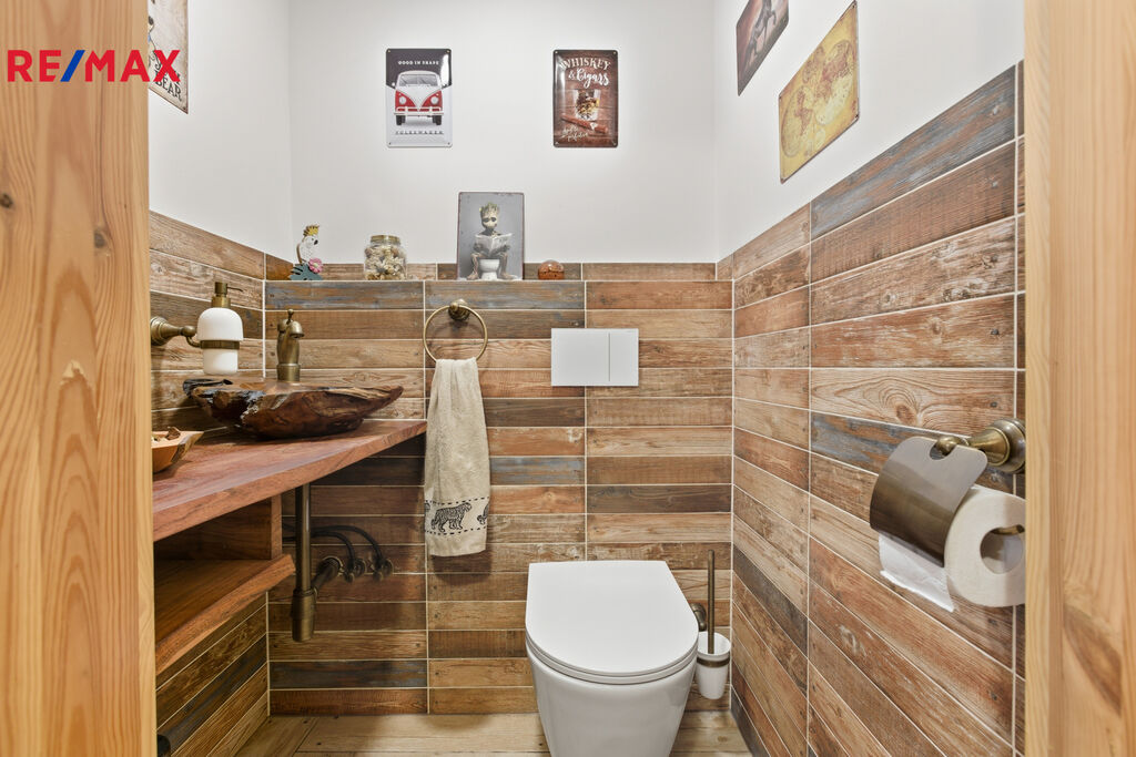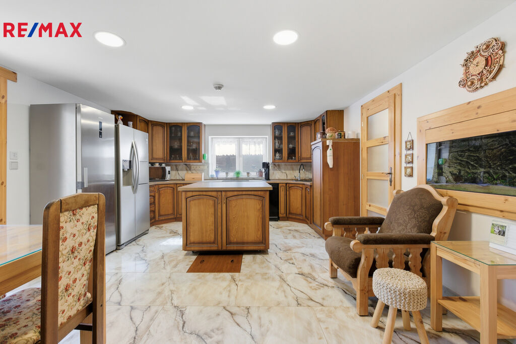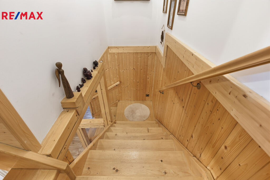 Interiér domu je laděný v přírodním stylu – dřevo dominuje podlahám, stropům i vestavěnému nábytku. První patro nabízí pracovnu, moderní koupelnu s WC, kuchyň, která důmyslně ukrývá pod posunovacím ostrůvkem sklep o velikosti 6m2 (zajištěno odvětrávání-cirkulace vzduchu), hernu pro děti, prostorný obývací prostor s jídelnou a kuchyní v otevřeném konceptu, technické zázemí a garáž. Kuchyňská linka na míru, bohaté úložné prostory, rustikální doplňky, krbová kamna a velké akvárium pod televizí tvoří jedinečnou atmosféru. Ve druhém patře najdeme několik ložnic a koupelnu s WC. Schodiště a detaily z masivu vytváří útulný, ale zároveň reprezentativní vzhled.