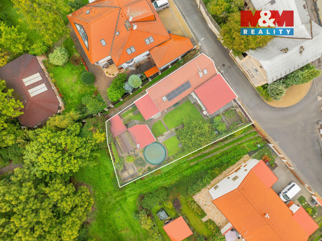 K dispozici je také suchý sklep (14,47 m²), altán s krbovými kamny (17,22 m²), bazén, dvě kůlny a kryté parkovací stání. Dům je vybaven vraty na dálkové ovládání a pracovním výtahem, což zvyšuje jeho komfort i praktičnost.