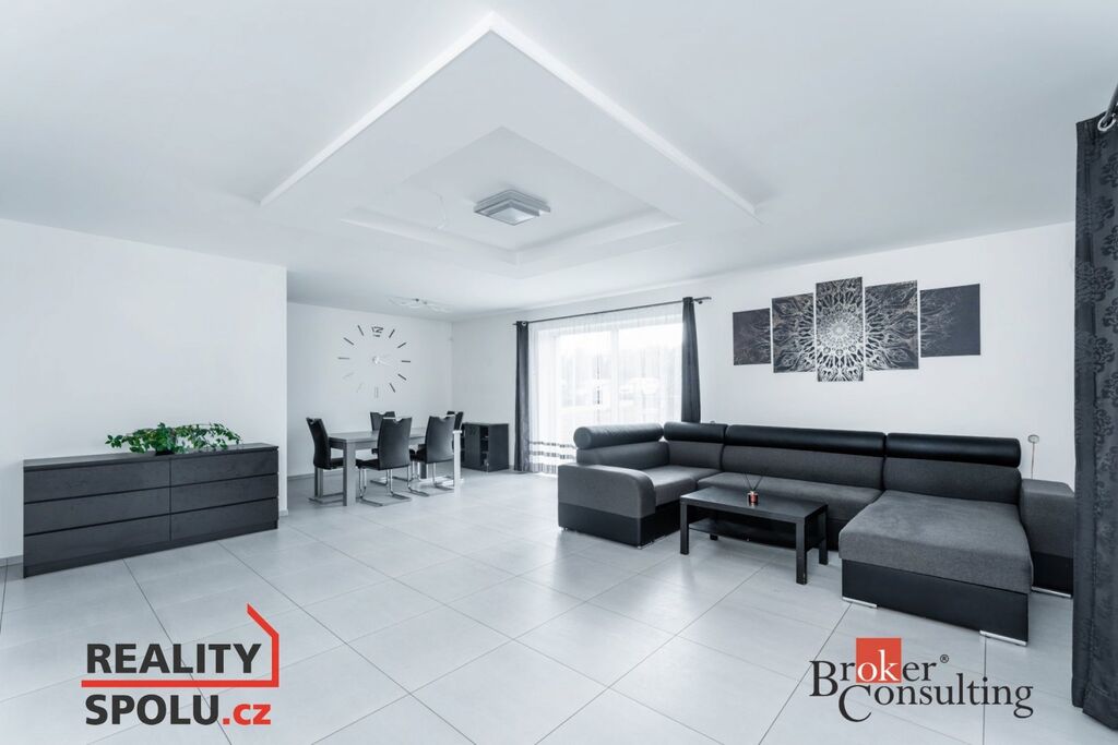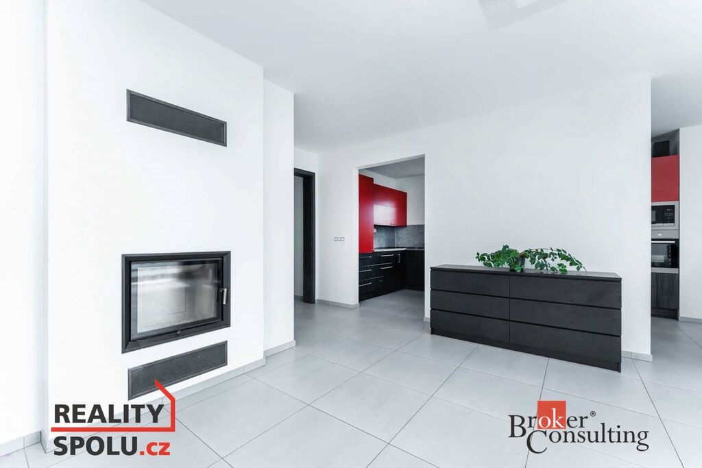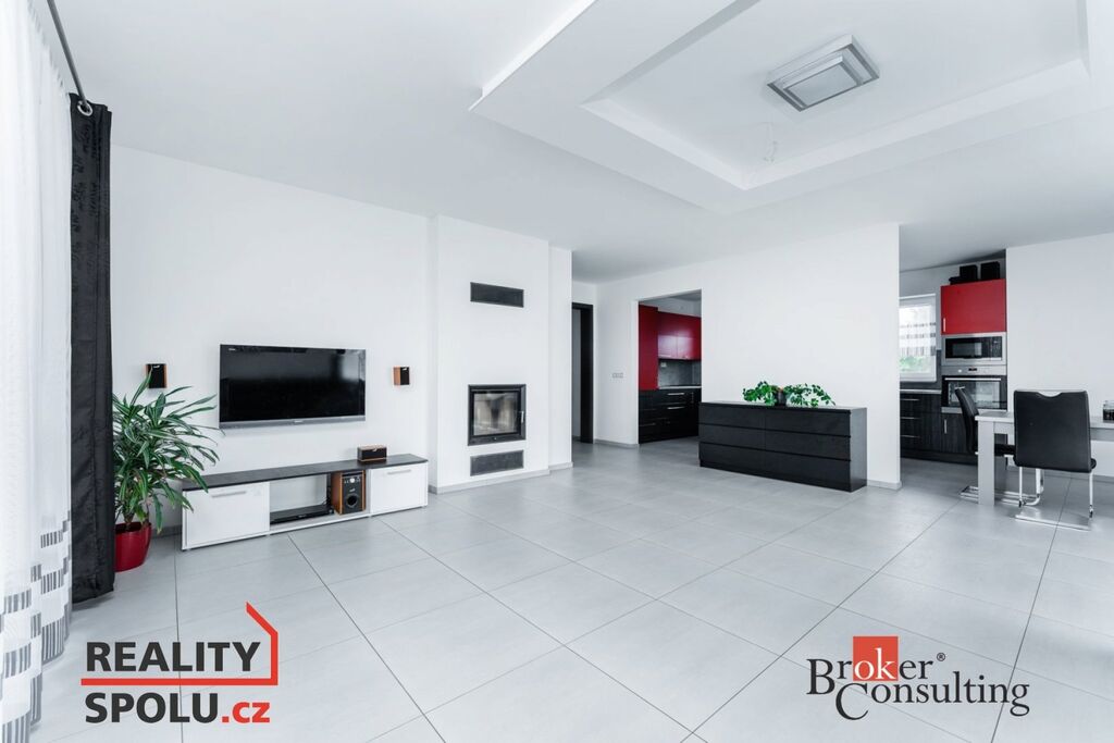 Dům je promyšleně rozdělen do denní a noční zóny. Z prostorné vstupní haly se dostanete do hlavní obytné části – světlého obývacího pokoje s krbem, navazujícího na moderní kuchyň s jídelním koutem. Z obývacího pokoje je přímý vstup na hlavní terasu a do zahrady.