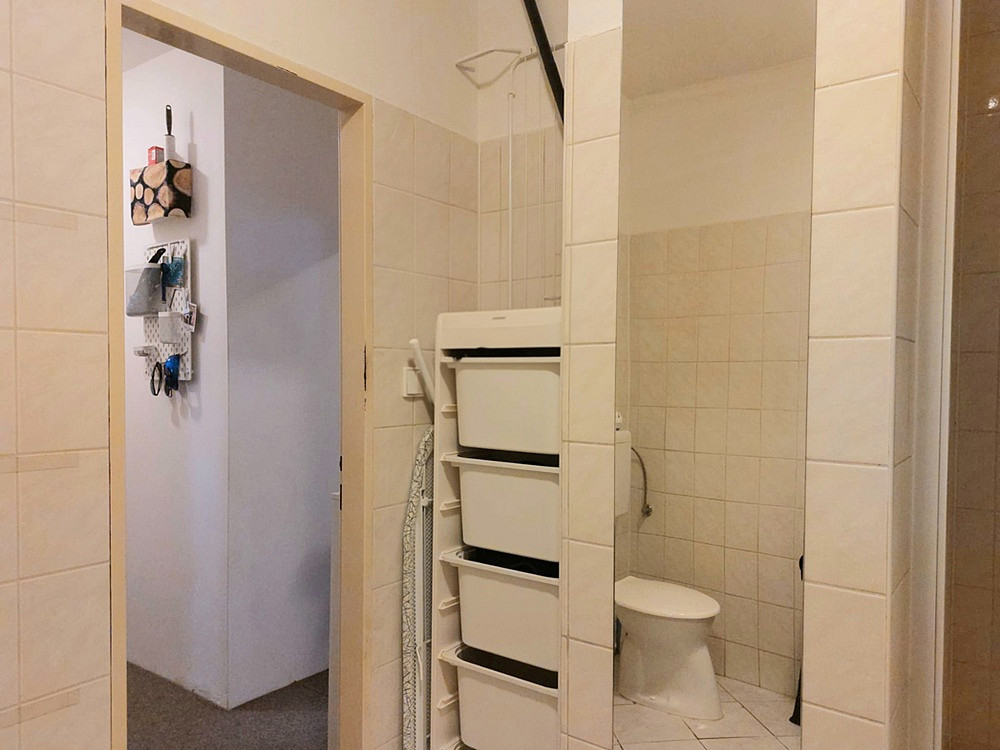 Dispozice – pokoj s kuchyňským koutem, předsíň, koupelna se sprchovým koutem společně s WC.