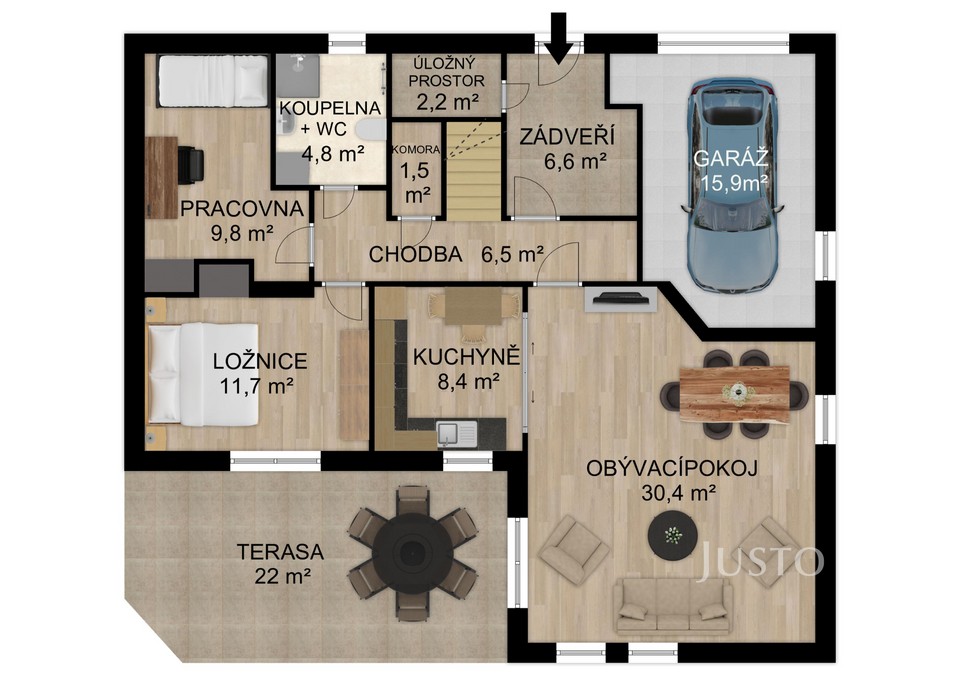 Celková plocha domu (včetně garáže, bez terasy): 153,8 m²