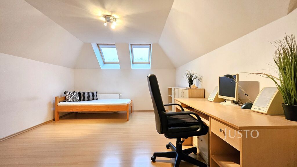 V podkroví Vás potěší šatna o výměře 2,8 m². Dále jsou zde dvě prostorné ložnice 14,8 m² a 17,6 m². Koupelna je s toaletou, bidetem, rohovou vanou, přímo odvětrána oknem. Ložnice v podkroví jsou plnohodnotné a bez výrazně snížených šikmých stropů, takže působí vzdušně, prostorně a nabízejí plnohodnotné využití každého metru čtverečního.