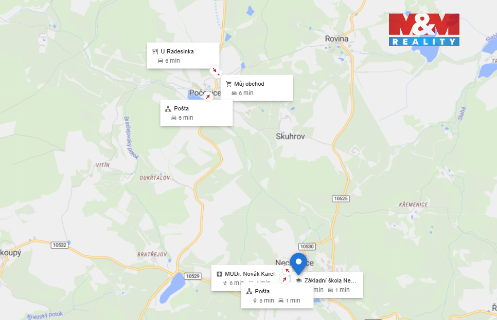 Infrastruktura: Napojení na elektřinu, obecní vodovod a kanalizaci je na hranici pozemku.