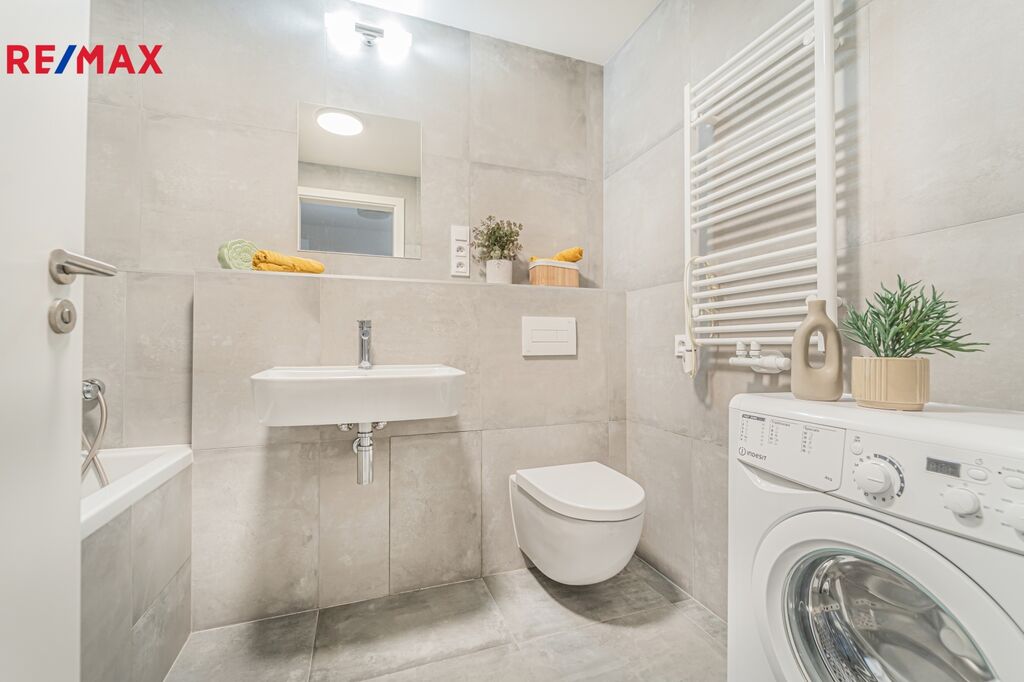 Kvalitní dřevěné podlahy, velkoformátová okna a elegantní koupelnové obklady podtrhují moderní charakter bytu.