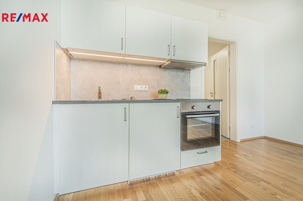 Byt je vybavený, jak je vidět na fotografiích – kuchyňská linka, lednice s mrazákem, varná deska, trouba a pračka.