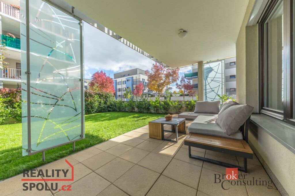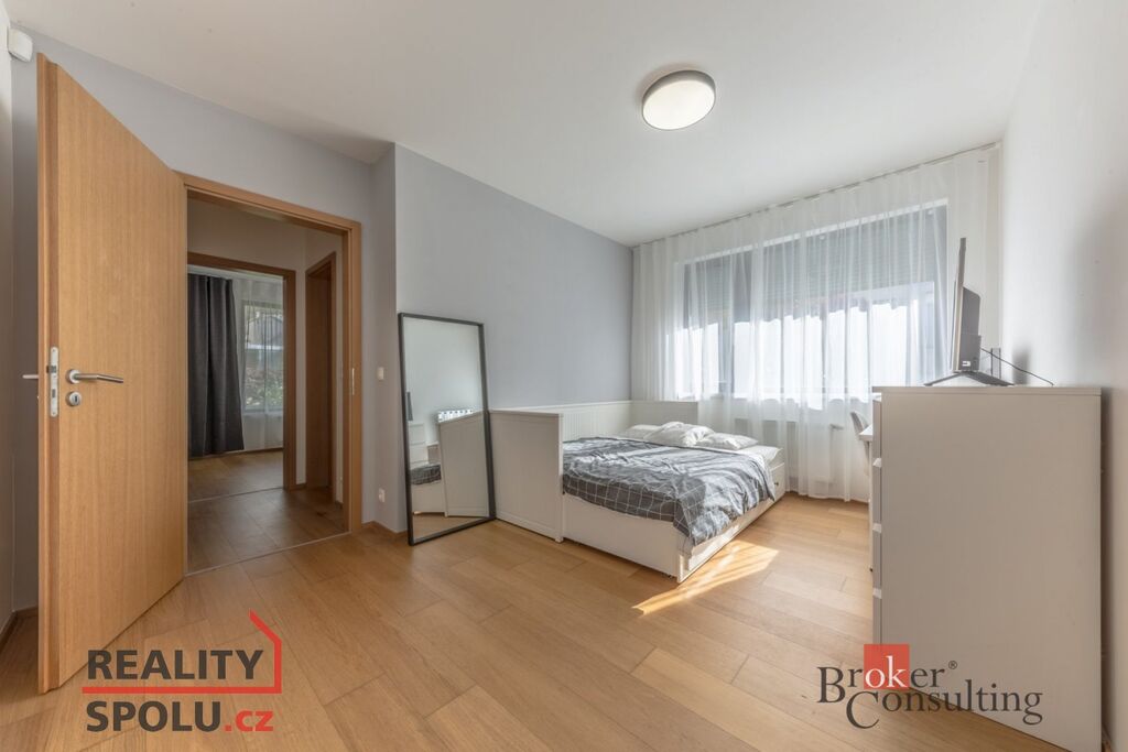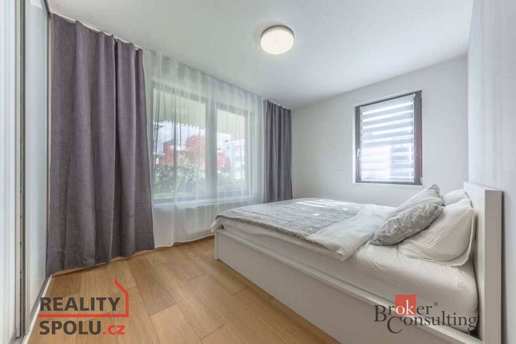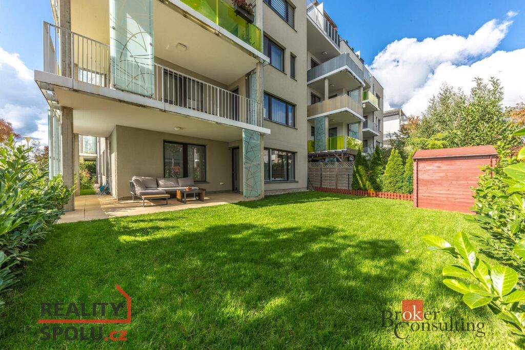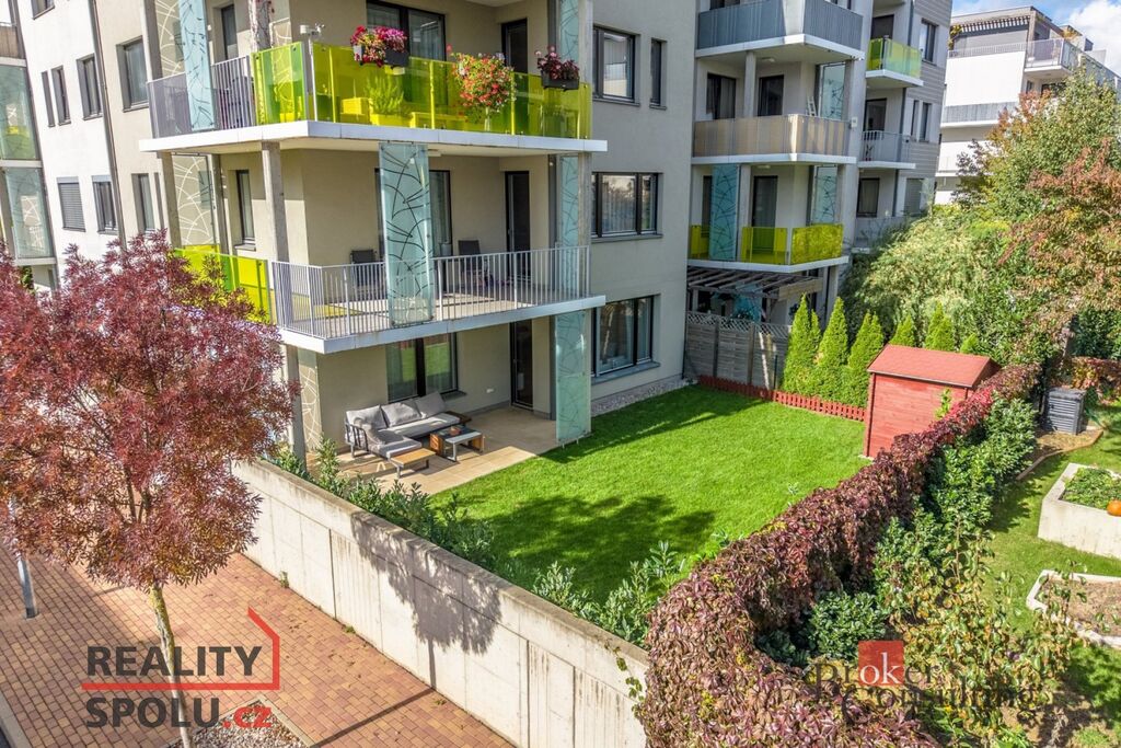 Obývací pokoj s kuchyňským koutem vybavený vestavěnými spotřebiči je vzdušný, prostorný díky velkým oknům a s přímým vstupem na terasu se zahradou (zde je i přívod vody). Obývací pokoj je oddělený posuvnými dveřmi do pouzdra od samostatných ložnic ( s rozlohu 13 m² a 13,9 m² ), které poskytují dostatek soukromí pro rodinu či práci z domova. V ložnici i předsíni jsou prostorné, vestavěné skříně. Samozřejmostí je koupelna s vanou, umyvadlem a toaletou, dále je v bytě samostatné WC, tato místnost je nyní využívána jako komora. Byt se nachází ve zvýšeném přízemí, není na úrovní chodníku, skýtá dostatek soukromí a bezpečí. Orientace bytu je na východ a jih, okna v celém bytě mají bezpečnostní fólie, dále jsou vybavena předokenními roletami s elektrickým ovládáním, které lze ovládat manuálně i dálkově telefonem přes aplikaci. V celém bytě je nainstalovaný bezpečnostní systém Jablotron a vstupní dveře jsou bezpečnostní.