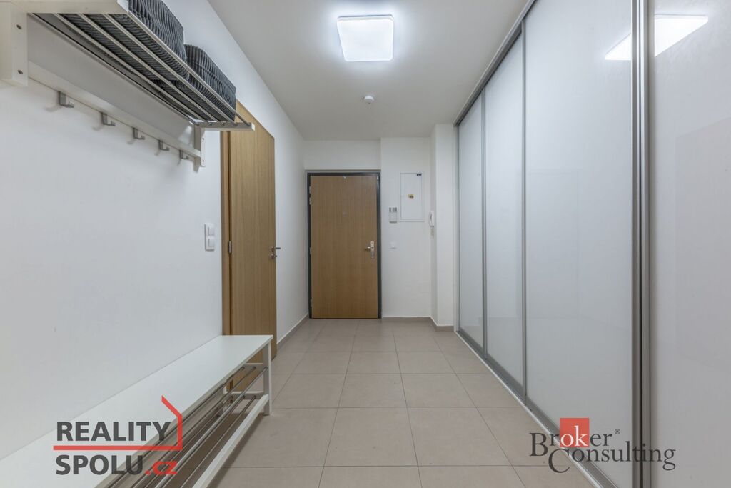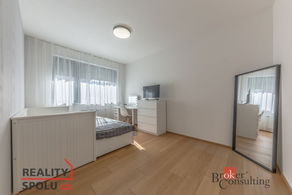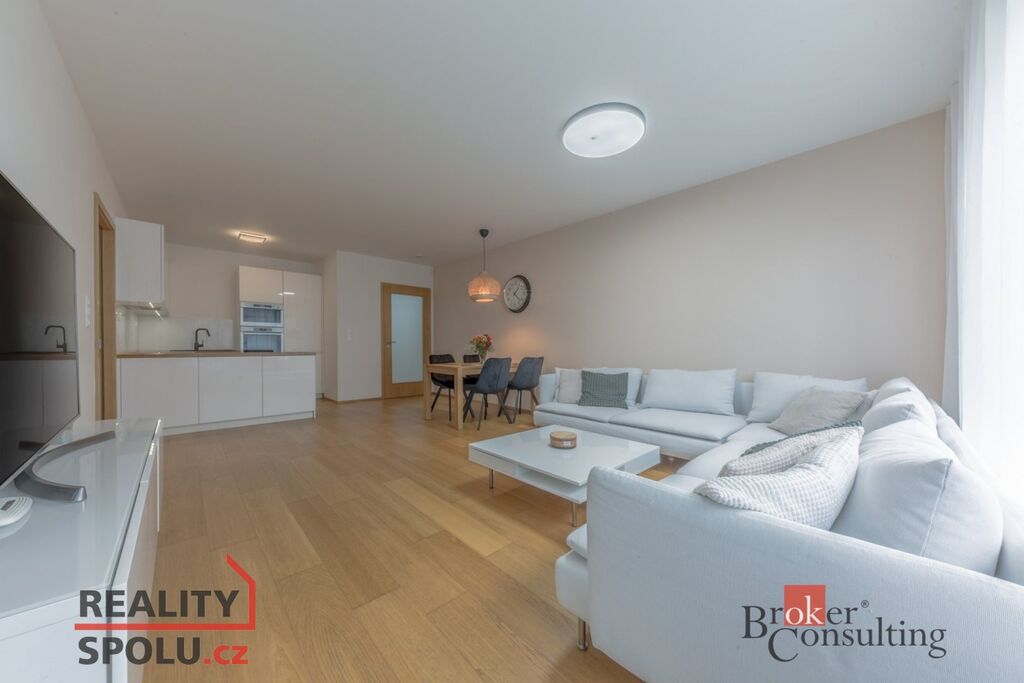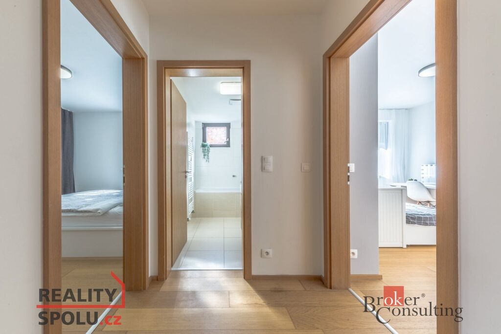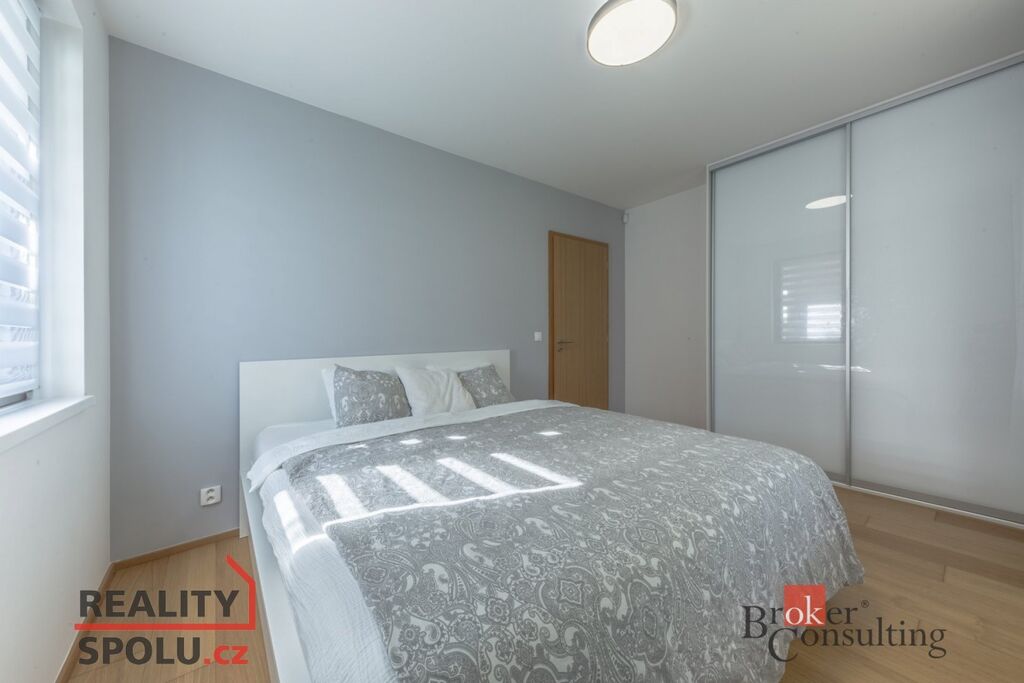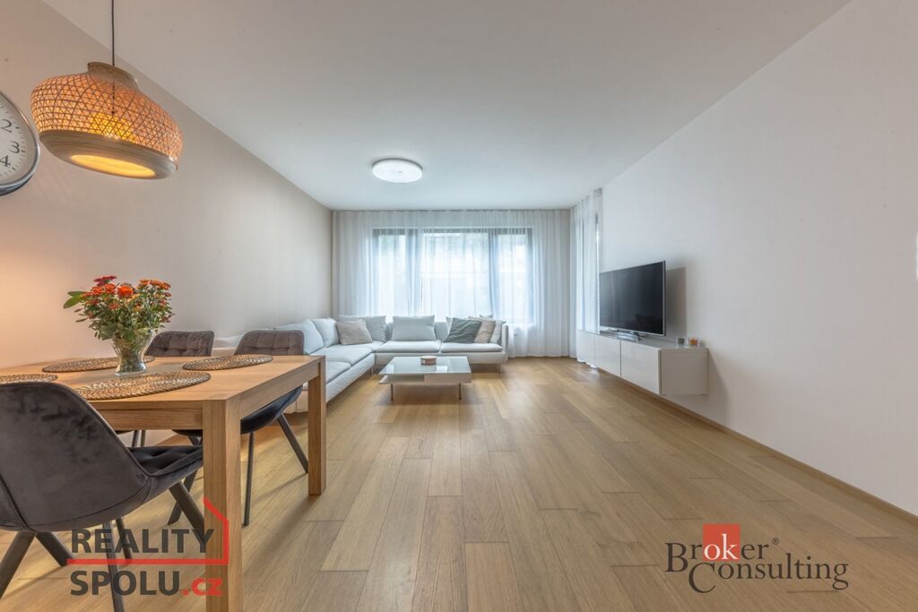 Obývací pokoj s kuchyňským koutem vybavený vestavěnými spotřebiči je vzdušný, prostorný díky velkým oknům a s přímým vstupem na terasu se zahradou (zde je i přívod vody). Obývací pokoj je oddělený posuvnými dveřmi do pouzdra od samostatných ložnic ( s rozlohu 13 m² a 13,9 m² ), které poskytují dostatek soukromí pro rodinu či práci z domova. V ložnici i předsíni jsou prostorné, vestavěné skříně. Samozřejmostí je koupelna s vanou, umyvadlem a toaletou, dále je v bytě samostatné WC, tato místnost je nyní využívána jako komora. Byt se nachází ve zvýšeném přízemí, není na úrovní chodníku, skýtá dostatek soukromí a bezpečí. Orientace bytu je na východ a jih, okna v celém bytě mají bezpečnostní fólie, dále jsou vybavena předokenními roletami s elektrickým ovládáním, které lze ovládat manuálně i dálkově telefonem přes aplikaci. V celém bytě je nainstalovaný bezpečnostní systém Jablotron a vstupní dveře jsou bezpečnostní.