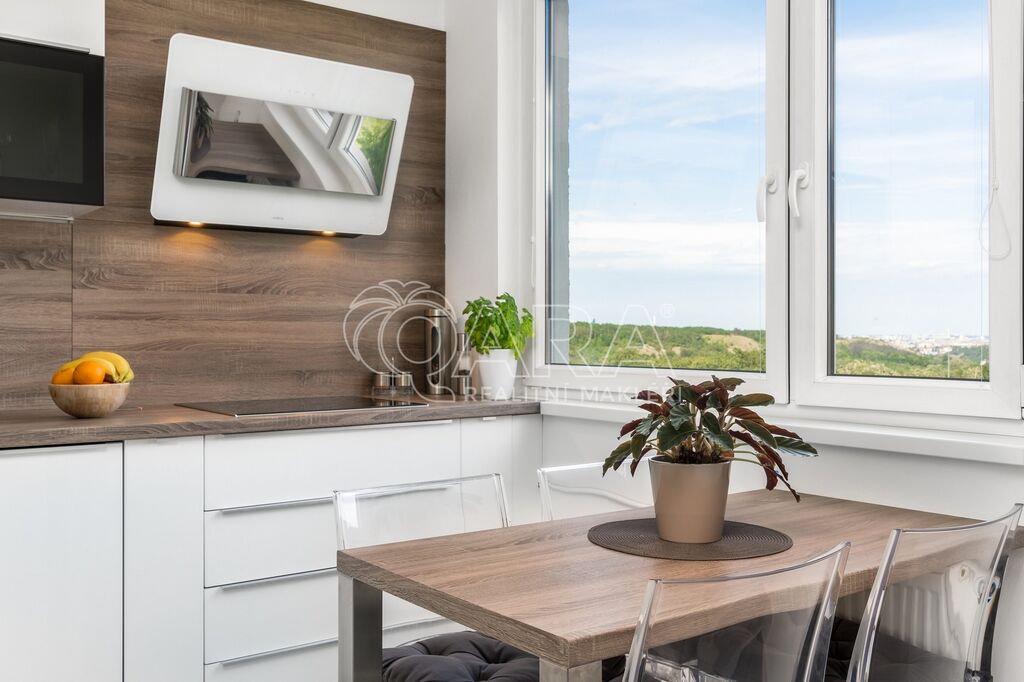 V kuchyni budete moci využívat kvalitní spotřebiče jako elektrickou troubu, indukční varnou desku, myčku, lednici s mrazákem vše zn. Bosch a digestoř zn. Elica. Ve všech pokojích jsou položeny plovoucí podlahy, v kuchyni, na chodbě, koupelně, WC a komoře je dlažba. V celém bytě jsou plastová okna, v obývacím pokoji jsou navíc osazena venkovními roletami s elektrickým pohonem. Ve všech místnostech jsou vyměněny topná tělesa za nová. Instalovány jsou bezpečnostní vstupní dveře zn. Sherlock. Zcela jistě oceníte i moderní zpracování koupelny a samostatné WC. Relaxovat u kávy budete moci na novém balkoně o velikosti 6 m2. Balkon s nádherným výhledem je i kompletně zasklený.