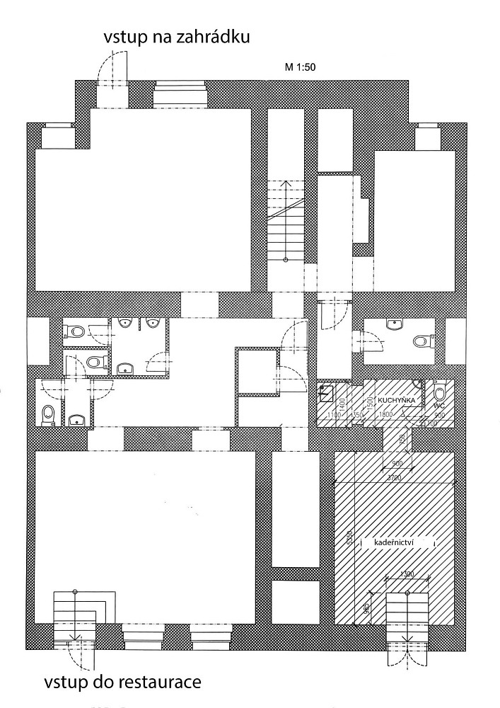 133 m² – hlavní prostor restaurace (vstup z ulice, kuchyně, zázemí)
