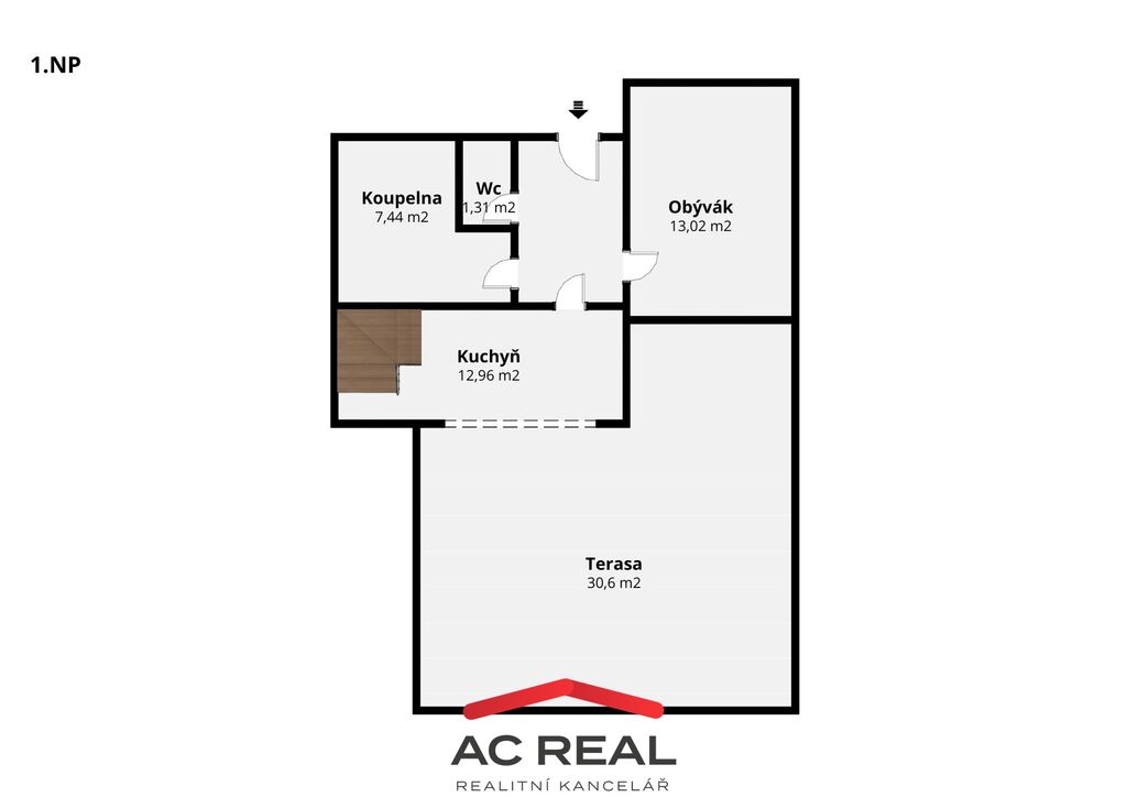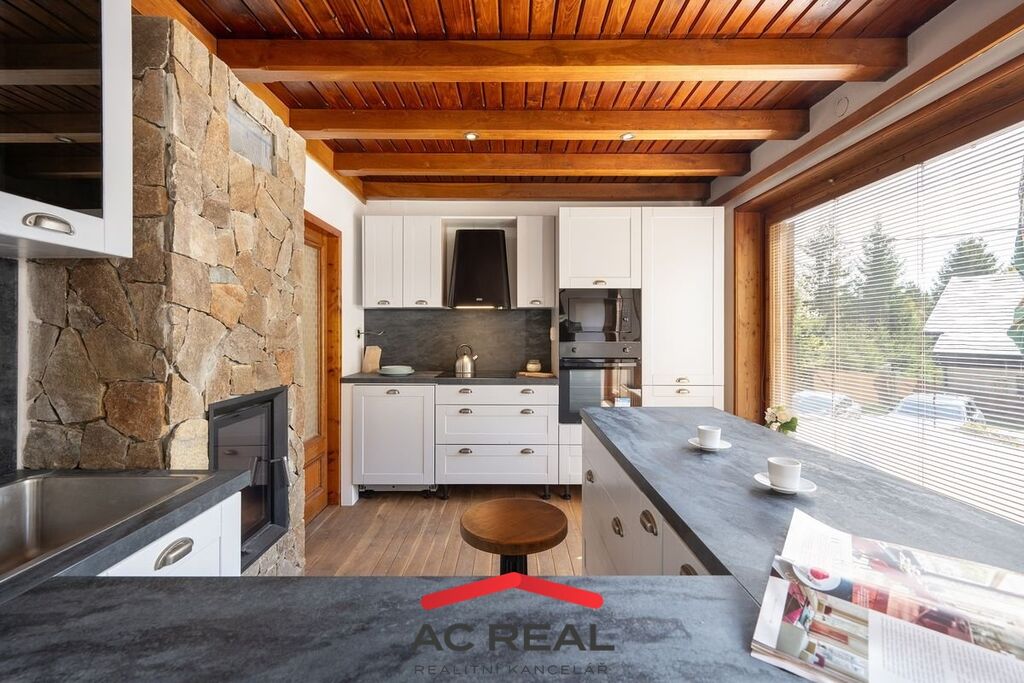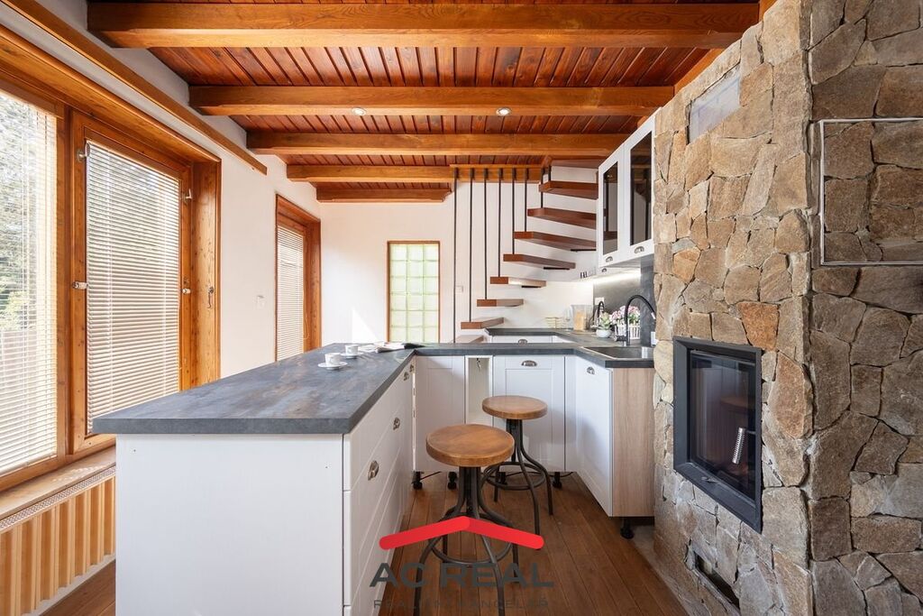 Hlavní zóna klidu: obývací pokoj a prostorná obytná kuchyně s novým krbem. Obě místnosti s přímým vstupem na velkou terasu. Ráno káva, večer víno a příroda na dosah.