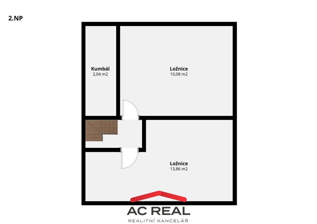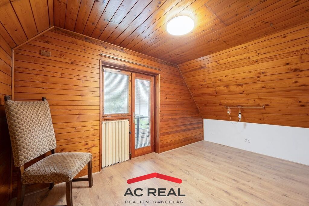 V patře dvě samostatné ložnice a chytrý přístěnek na uložení věcí – pohodlí pro rodinu, hosty i pracovní kout.