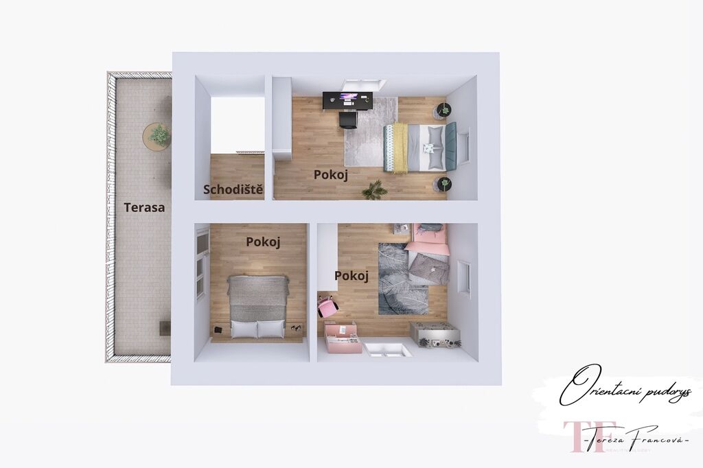 Patro je vyhrazeno pro klidovou část domu – tři útulné pokoje, z nichž jeden má vstup na velkou terasu orientovanou na jihozápad, odkud si můžete vychutnat krásný výhled do okolí i západy slunce.