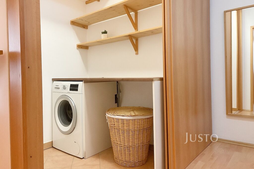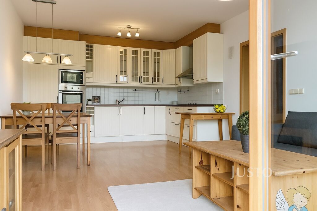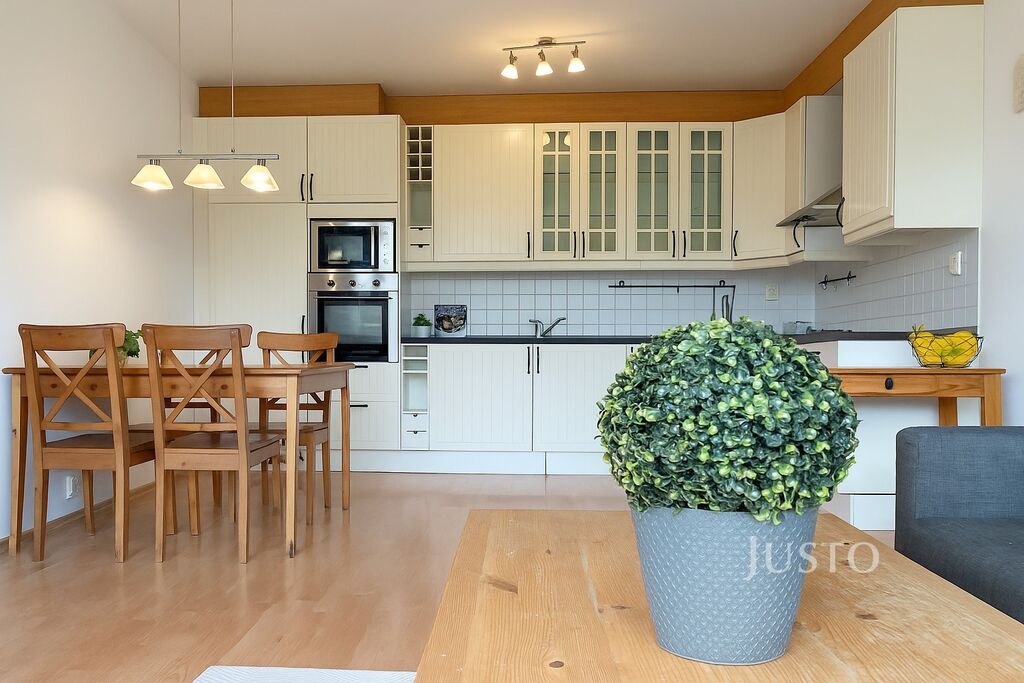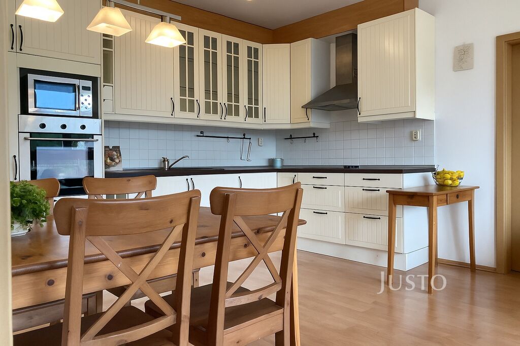 - kuchyň s vestavěnými spotřebiči (lednice, mrazák, myčka, indukční varná deska, trouba) + mikrovlnka